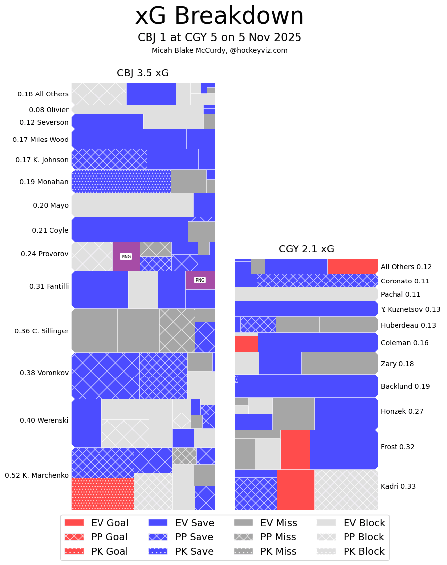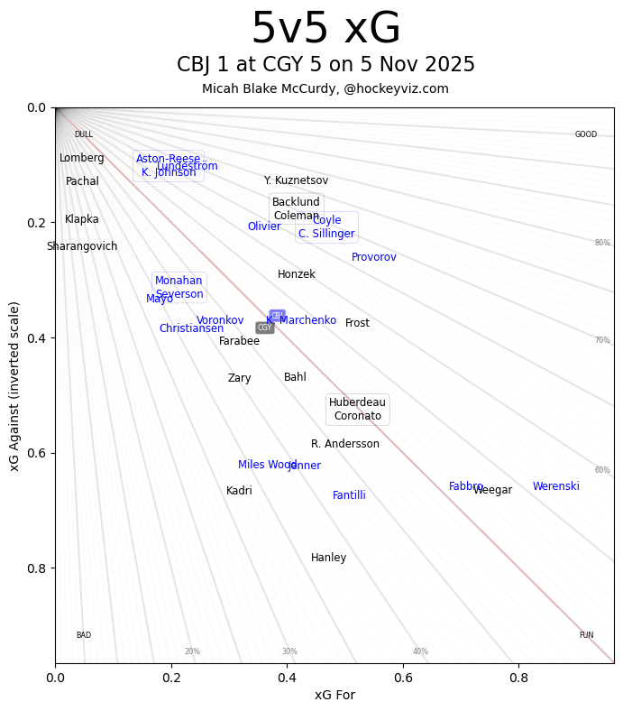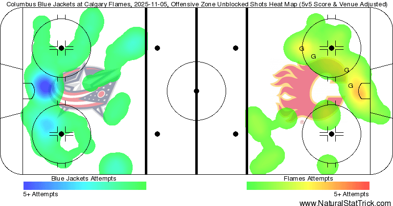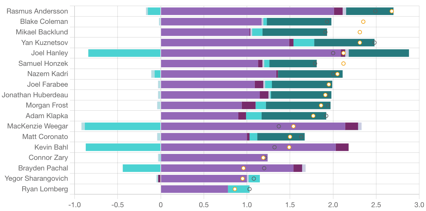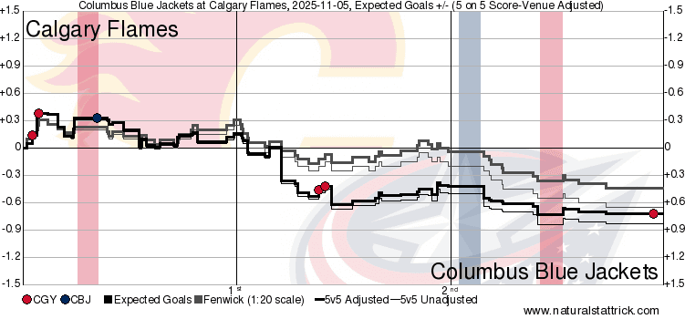 Corsi King – Mikael Backlund (66.93 CF%), Samuel Honzek (56.16 per cent) and Blake Coleman (61.33 per cent) were not victims of the Blue Jackets shooting gallery. They doubled their total shot attempts and limited all high danger opportunities against at 5v5. They showed up big for their teammate on his big day. Throw two goals (though one was an empty net) into the fray and it was a darn good night for them. 2020 second round pick Yan Kuznetsov made his season debut – his second NHL game – and collected his first NHL point on an assist. He didn’t surrender any high danger looks either and looked more than comfortable defending on that third pair than some other skaters this season. Calgary’s getting a look at what they have there – that’s a darn good thing. (P.S. play the 19-year-old too, will ya?)