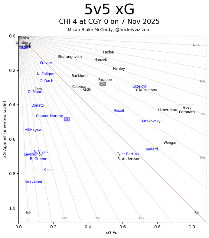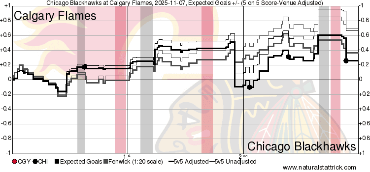 xGF% – Yan Kuznetsov (68.23 per cent). Welcome to the show in a big way. Third NHL game, thrust into minutes and situations the coach historically has allowed young players to avoid, and he thrived. Strong defensively in his own end, especially in front of the net. That paired with a good first pass to get the puck out of the zone when given the opportunity. He ended up with 4 shots on goal, 2 hits, and a 4-0 advantage in high danger shots at 5v5. That’s the kind of performance you want to see out of your former second round defenceman early in his career. Even on a night when there wasn’t much success on the offensive side of the puck you can see Kuznetsov showed he can play up here. Chicago isn’t playing like the basement Blackhawks anymore – quality performance by the young defender.