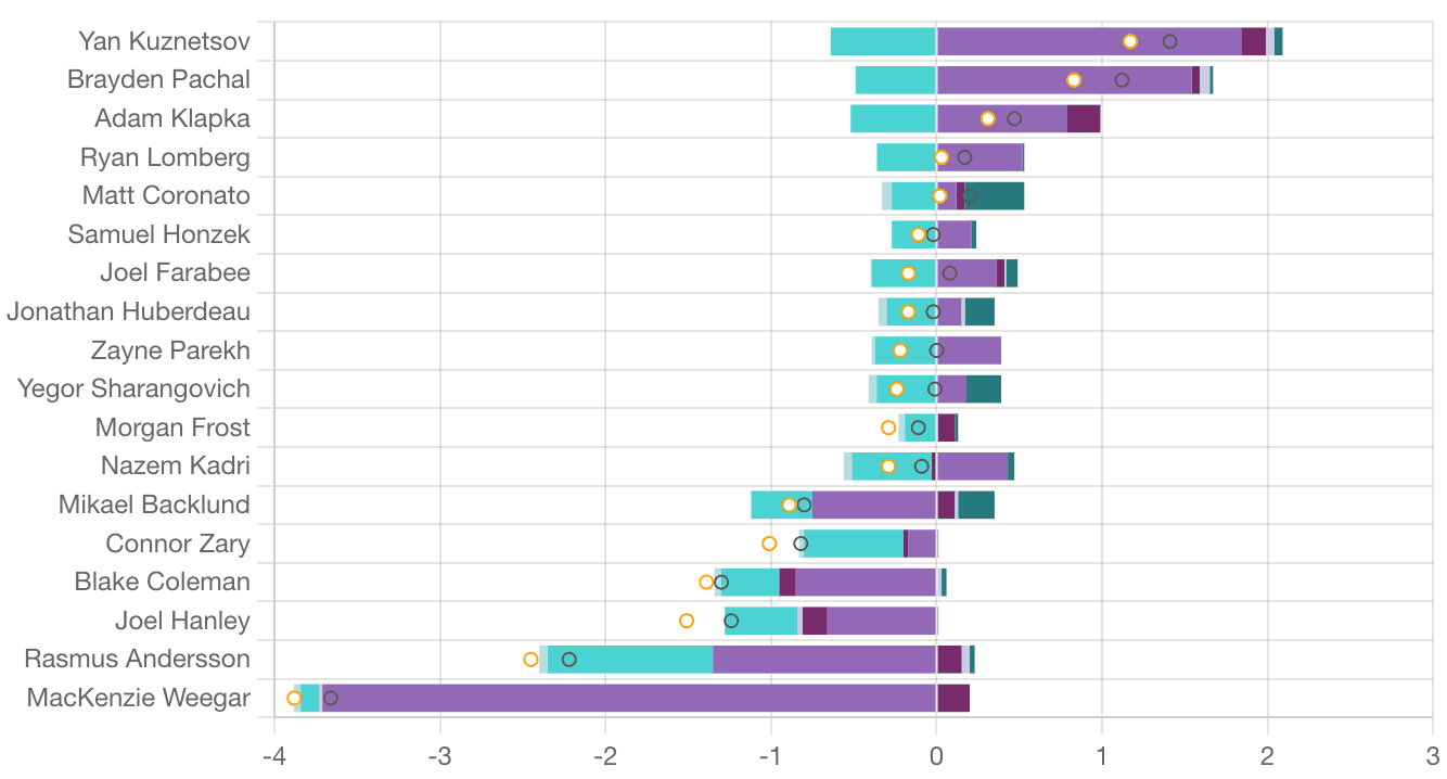 Corsi King – Joel Hanley (73.76 per cent) led the way in terms of percentages while Morgan Frost (64.72 per cent) led in overall shot attempts for. He was just one ahead of Matt Coronato (63.69 per cent) who managed to make sure 11 of his 20 shoot attempts actually found their way to Spencer Knight. Coronato looked dangerous, sure, but most of these shots weren’t incredibly dangerous. Calgary isn’t getting lateral passes that get the goaltender moving done unless they come all the way out at the blue line. Off the rush in the last game was where they found the most success – creating turnovers and jumping on odd man rushes. Have to find a way to get back to that.