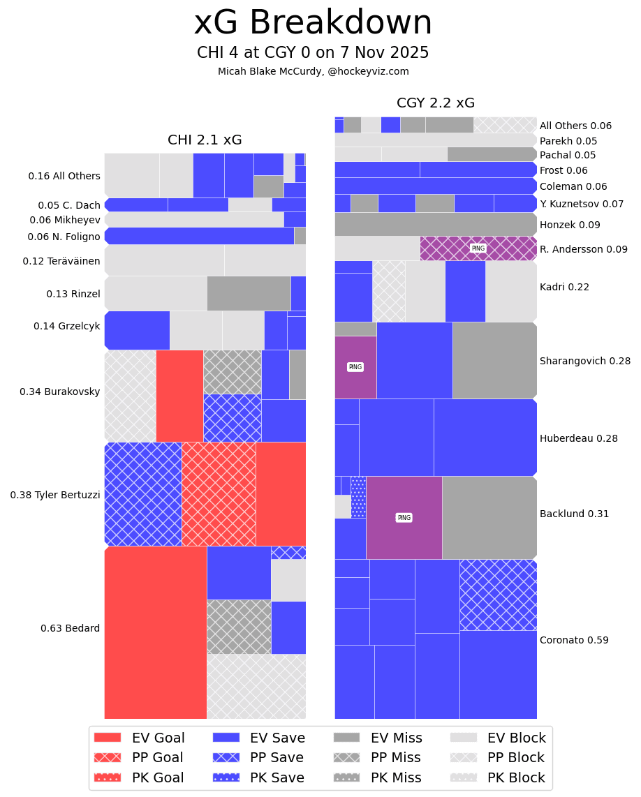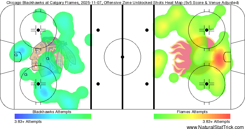 It’s a Team Game – It’s unfortunate for the Flames they could not use the momentum from Kadri’s 1,000th game as a springboard to more success – instead things came to a screeching halt. No, Chicago didn’t dominate 5v5 play forcing Wolf to be spectacular or near perfect, but rather the Flames showcased that their own inability to generate offence will sometimes be their downfall. They are now a league worst 1-for-25 on the power play at home as the unit(s) consistently showcase as one of the most inefficient ones in the game of hockey as a whole. I do see a lot more effort to cut to the middle and get scoring chances down the middle lane of the ice, but it’s still too much of a default to perimeter play and not enough danger being generated for an attack. If they want to stay on the wall until possession is fully established, they are going to be waiting a long time – they need to get better at their open ice passing, specifically in their short passing game. The consistent throwing back to the point gets predictable and, if coached well, gets easier to defend. Overall, it was another fine night structurally for the Flames, a superstar forward was the main reason they lost. Both because the other team had one and because Calgary just doesn’t have a single person that could do to someone else what Bedard just did to them (1g, 3A for the Chicago C).