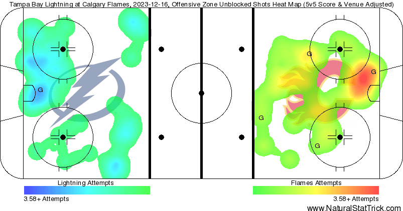 Taken By Chance – For all those chances – and even AJ Greer (100 SCF% // NA) getting the goal – none of the chances the fourth line created were of high danger variety. They did what you wish they would do every night and play around 10 minutes of 5v5 without surrendering any bad looks against. By those standards this was a knockout game for them. Martin Pospisil (100% // NA) also never saw a high danger look for or against. Blake Coleman (66.45% // 61.23%) led all Flames skaters being involved in the most high danger chances on the team at 5, but he saw 3 come back his way too. Typically, as long as you outpace what you create you’ll do alright – that’s been Coleman this year in a nutshell.