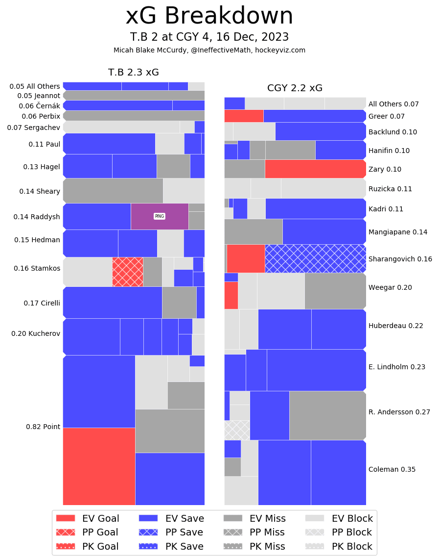 Corsi Clown – Yegor Sharangovich (33.18%) and the Flames line of Lindholm (35.24%) and Mangiapane (39.11%) were the catalyst for most of the early second period offence. Outside of that little stretch they were busy spending time in their own zone. Nikita Kucherov has to take advantage of someone when he and Point play together and tonight it felt like he was always out there against that trio. They were the only three Flames under 50% on the night.