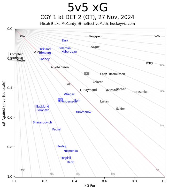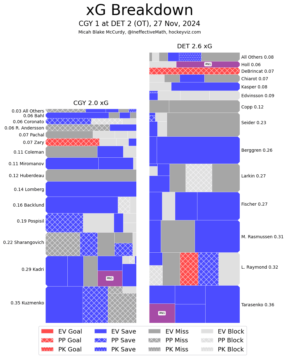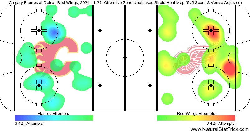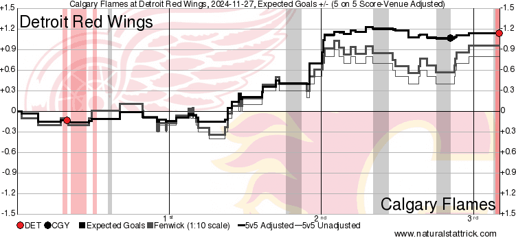 Corsi King – When I talk about the team not finding offence that does not include Connor Zary (81.17%) who has been the Flames best offensive forward this season. His ability and willingness to manoeuvre through open ice to get quality looks was on full display in this match. He rarely got pushed back into his own zone and got the equalizer on a beautiful goal from distance on the man advantage. Only one defenceman got on the positive side of attempts in Brayden Pachal (57.34 per cent). Detroit has some speed, and they were exposing the Flames by using it to burn down the wings. It got them an advantage in a lot of categories – just not saves.