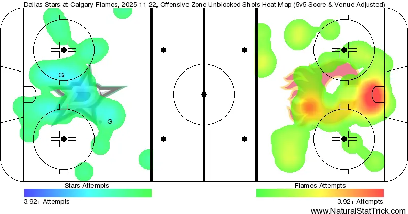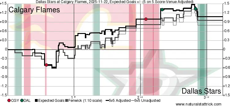 Corsi King – Blake Coleman (78.07 per cent) just remains a model of consistency. I could see why any playoff team with serious dreams of contending want Calgary to enter early sell mode. Blake Coleman would be a significant addition to any team. He is currently being tasked with aiding in sparking Connor Zary (63.12 per cent) to find his old game. Spending the majority of your shifts in the offensive zone is a good way to start. I also want to acknowledge that all night the Flames coaching staff heavily relied on Yan Kuznetsov (51.55 per cent). The top-4 defence were rolled out significantly more than the third pair and Kuznetsov was included in that bunch. From waivers to start the season to a surefire, dependable top 4 option before American Thanksgiving. Just another reason to say there’s too much weight put into pre-season decisions. Providing some stability for Mackenzie Weegar (49.92 per cent) to get back to the top of his game is an added bonus.