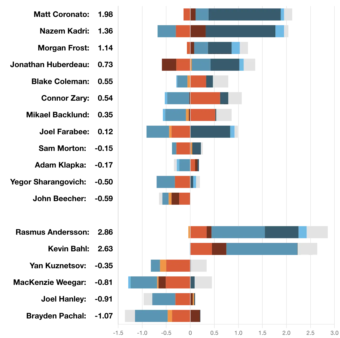 Taken By Chance – A week or so ago there was a few comments online about how Rasmus Andersson (67.89 SCF% // 77.14 HDCF%) had been bad for a quite a long time. I will say I agree that last year – particularly the second half – he struggled more than he had at any other point of his career. However, since the start of this season he’s not only got back to being a surefire top 4 defenceman, but rather found another gear along with it. The Flames control a lot of what goes on during Andersson’s minutes and with the offence starting to come he’s just looked every bit the part of a true top pair defenceman. 7-2 advantage in 5v5 high danger chances for Andersson, with a power play assist to boot. Standout performance.