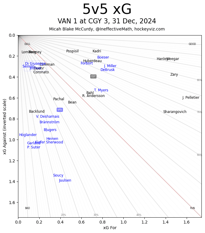 xGF% – Ryan Lomberg (32.56 per cent) fought twice in this match so he needs to have a mention. The fourth line did average fourth line things. Duehr (22.23 per cent) had one good opportunity, but he was moving too fast to stop on the puck – maybe next time. Mikael Backlund (16.92 per cent) and his line were pressed back by the Canucks at 5v5. Usually Backlund can push the play/chances to 50/50 with regularity but the number of games he is finishing below 30 per cent is starting to concern me. I’m used to talking about how automatic he is – I want to see that return.