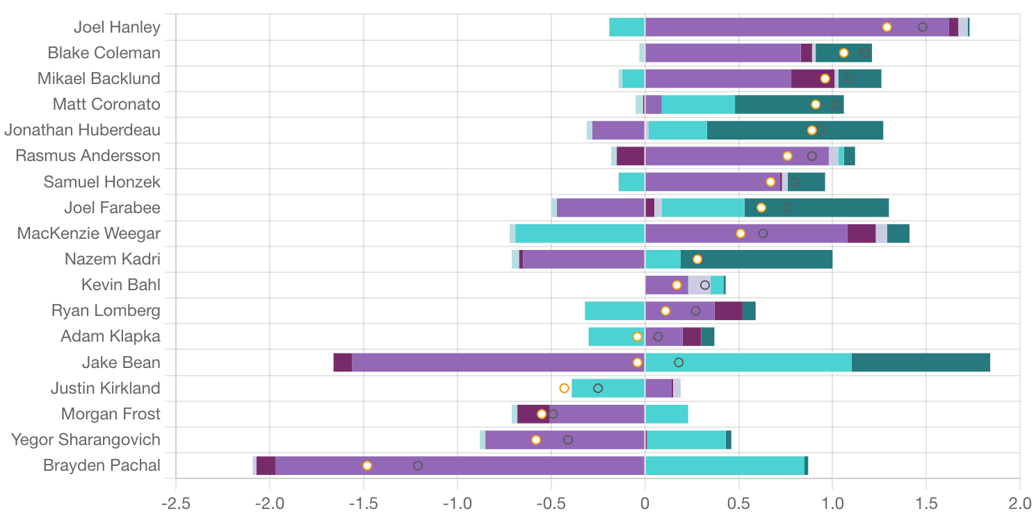 Corsi King – Joel Hanley (81.54 per cent) is a player I have questions about his role. When we talk about needing offence most people would go right to the forwards, but the defenders and their ability to aid in an offensive attack matter too. Hanley does always have great defensive metrics, but he also saps momentum on offence frequently. I don’t think he’s played bad at all this season, but I do think he needs to have a limited role if the Flames want consistent offensive success. What good is a 24 – 6 advantage in shot attempts if it only leads to 2 high danger chances? Shuffling the forwards is not the only thing that can be done to spark the offence. Samuel Honzek (71.54 per cent) came very close to potting another goal. Here’s hoping the first one of his career sparked something in him that can help him score more often.