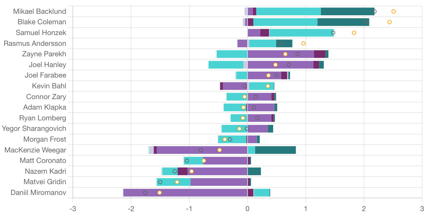 Taken By Chance – Rasmus Andersson (70.80 SCF% // 77.65 HDCF%) and Kevin Bahl (63.48 per cent // 77.65 per cent) finally had a game where they were able to push play up the ice. Andersson is usually around the offensive attack, but he’s been really close to popping one in lately. It still comes with defensive mishaps every now and then, but at least he actually helps improve the offensive abilities of the team. On the not-so-bright side of things Daniil Miromanov (23.32 per cent // 19.78 per cent) had a rough day at the office. He is not up to par in the defensive zone, constantly struggles to make a good first pass and finds himself out of place when defending regularly. I think the team knows about the struggles too, which is why he hasn’t played much. What happened in that one wasn’t great and Brayden Pachal sitting meant that wasn’t necessary. You’ve got too many RD – big deal – have one of them learn to consistently play on the left and ice your 6 best defenceman every night.