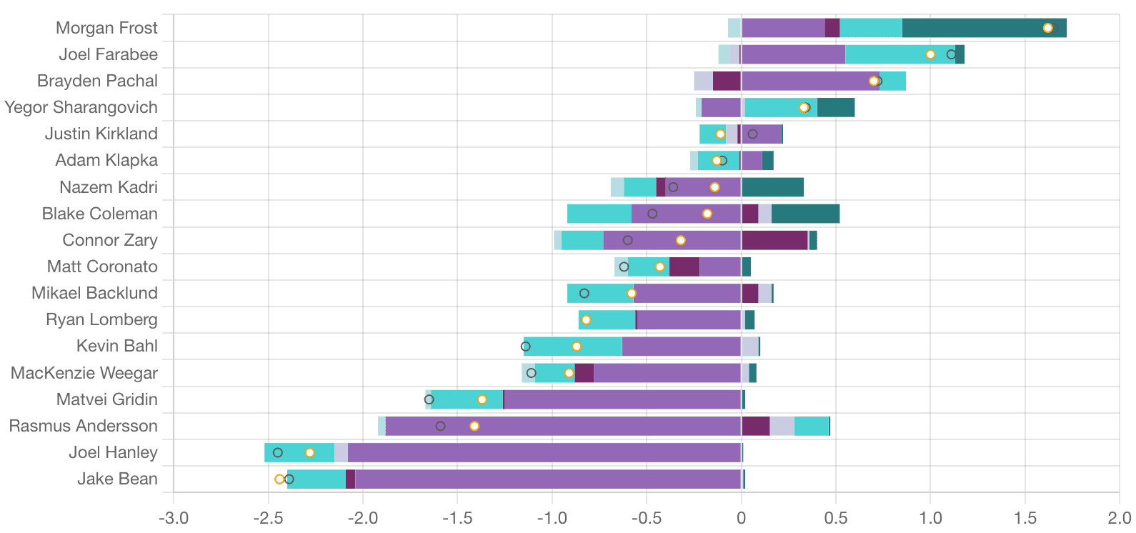 xGF% – Joel Farabee (91.85%) barely saw any chances of any quality against while deployed. Usually, a whole line ends up in a similar spot, but with the Flames not having consistent lines and a massively mixed up power play in terms of personnel variety, the order these fall in is a little obscure. Matt Coronato (74.14 per cent) was behind Farabee and Justin Kirkland (68.21 per cent) behind them. A good mix from every line. Of those three only Coronato was out for a goal against (two, actually). Blake Coleman (30.42 per cent) and the captain were on the bottom – I’m really not worried about them because they’ve always been able to figure things out sooner rather than later.