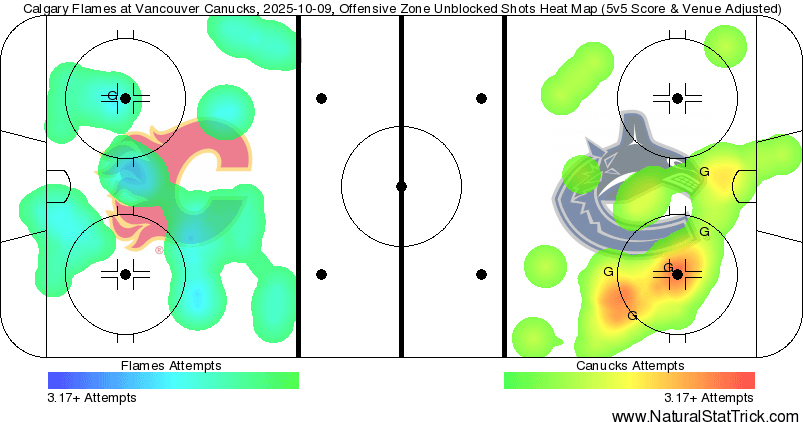 Corsi King – Joel Farabee (81.0%) led things for the Flames on the shot attempts front. It seems whoever gets to play with Morgan Frost (73.17 per cent) these days tends to find success. A quality centre can do that and I’m loving the early season look he’s showcasing. Mikael Backlund (36.59 per cent) was on the bottom of the list for a second straight game. The man receives a lot of hard match-ups so I’m lenient on the shot attempt totals and like to focus more on whether or not he limited high danger chances – he was not as successful as he was on night one. Right in front of Backlund was young Matvei Gridin (43.05%) who looked a little more pedestrian tonight. That was me being nice – he was not only on the wrong side of the scoring chances but was on the ice for four 5v5 goals against. A couple of them I’d want back, but regardless a rough second night at the office for the young Flames winger.
