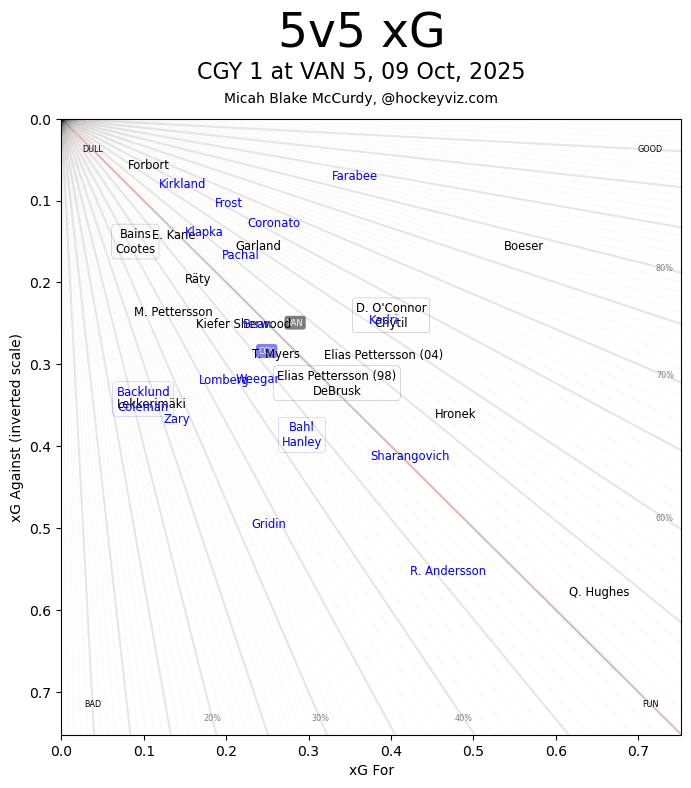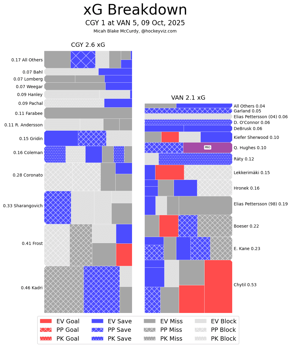 It’s a Team Game – Hockey is unforgiving. Game one sees the Oilers control possession, game flow, and scoring chance advantages yet the Flames found a way to persevere. Now after this game, Calgary held those same advantages before the Canucks came through and won. That’s hockey, baby. Early season seeing result triumph over process is not uncommon. I’m in year 5 of BTBs here at FlamesNation and year 8 of writing about the Flames overall and this happens to start every single season. It takes about 15-20 games before teams settle in and start playing really good, structured puck.