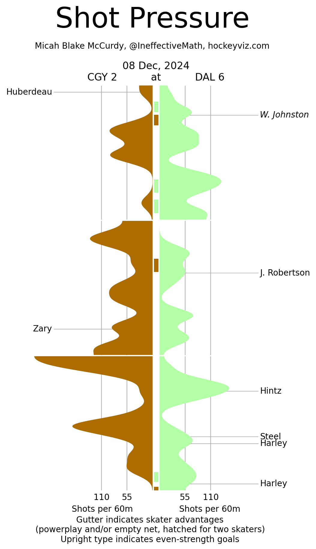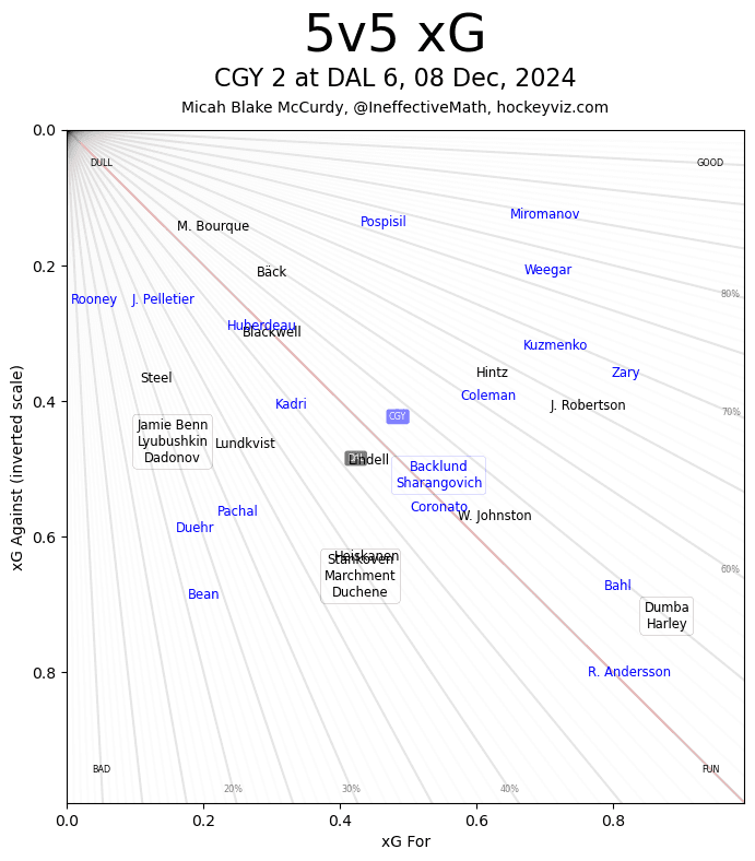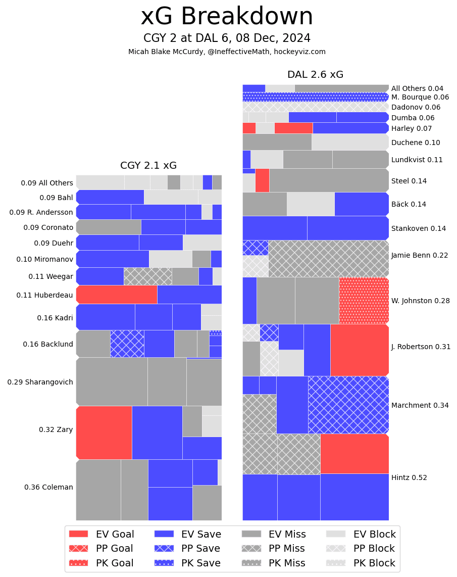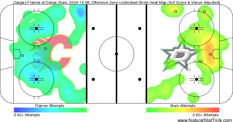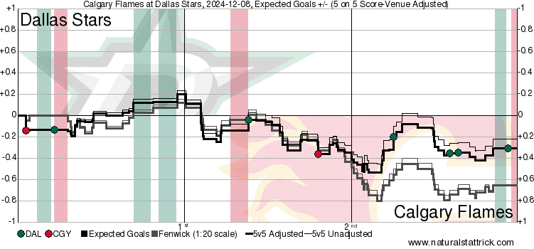 Taken By Chance – I didn’t think Kevin Bahl (53.83 SCF% || 36.04 HDCF%) had a particularly strong game tonight. He failed to clear the zone multiple times as a result of the Dallas Stars relentless pressure. It also resulted in him being out there for three 5v5 goals against. It was the biggest problem for Calgary – usually they are the faster team and are the first ones on the puck – instead, it was the Stars playing that role and Calgary had a hard time dealing with it. Someone on the team does need to figure out how to generate more than three high danger chances in a game as well. The stifling offence needs a bigger spark than a couple minor league call-ups.