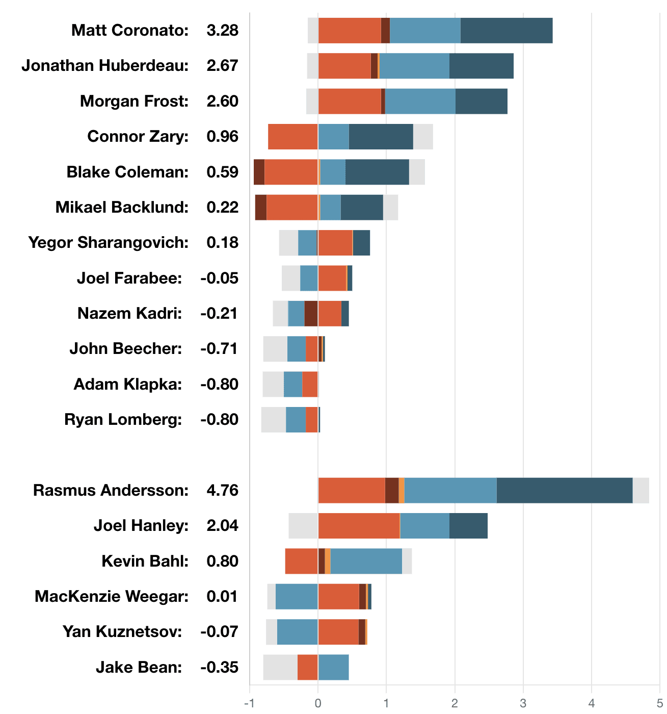 Corsi King – Matt Coronato (78.74 per cent) led the way for the team. That line with him, Frost (74.36 per cent), and Huberdeau (63.73 per cent) played a really solid game. Frost has started to really come into his own, if the wingers can find a way to expand on that – or he could figure that out – Frost could find himself with a career year. Keeping his current two linemates as they are would even amplify his total production – thankfully for him the Flames do not have any centres coming for his job, or anybody’s, this year.