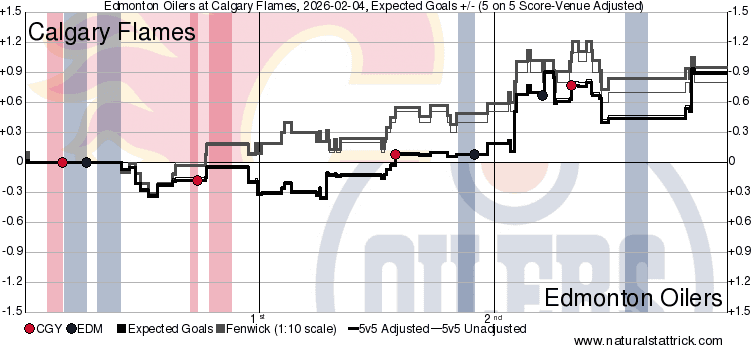 Taken By Chance – What really helps is when your top 4 defenceman can all press up and keep the ice tilted the other direction. MacKenzie Weegar (40.60 SCF% // 49.25 HDCF%) and Yan Kuznetsov (38.85 per cent // 49.25 per cent) were able to also get up and get involved in accumulating chances. 12 high danger chances collectively vs 10 against is a huge win in my books. Especially against players that can score goals like Leon Draisaitl’s. The other defence pairing – featuring Zayne Parekh (43.01 per cent // 32.53 per cent) – went 1 for and 2 against. Numbers won’t look pretty when the on-ice events are low, but it doesn’t mean anything was particularly bad. He got some valuable experience against some of the league’s best – the rest will follow along in due time.