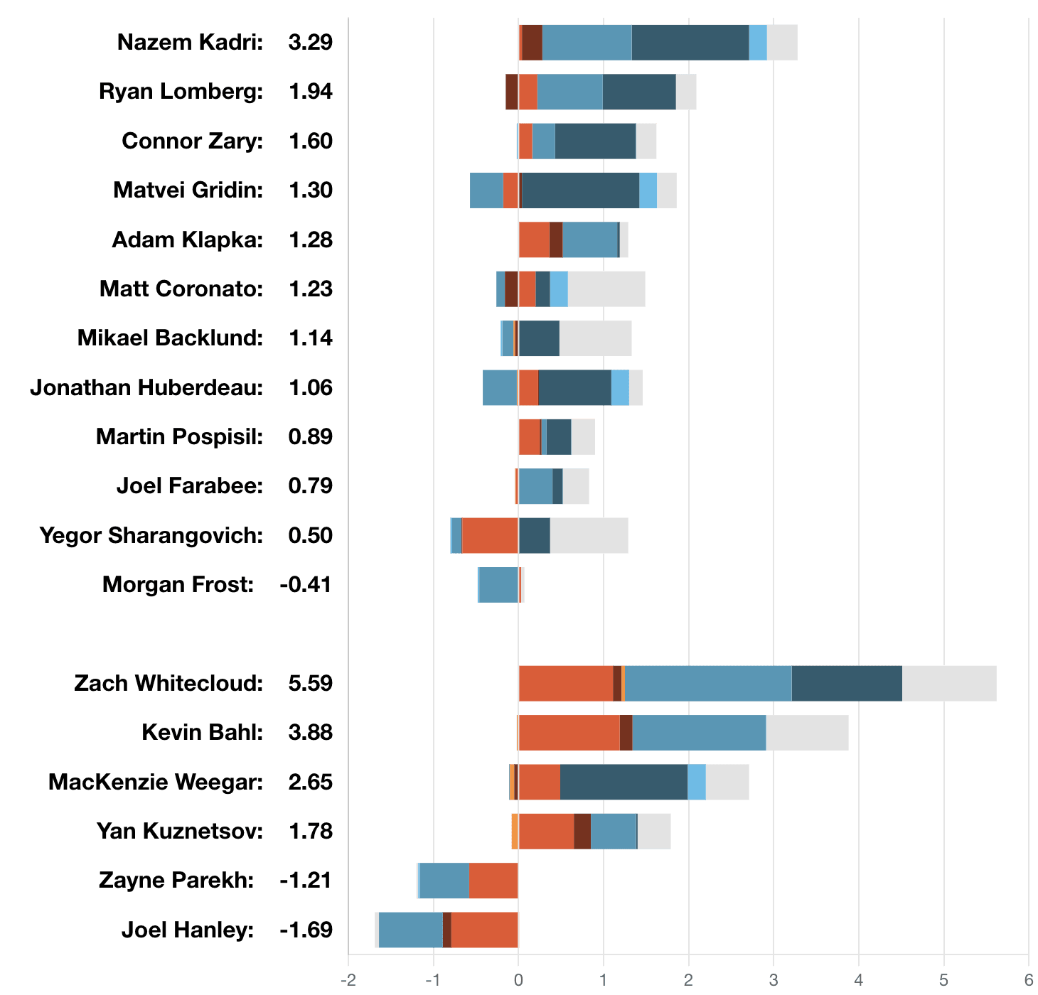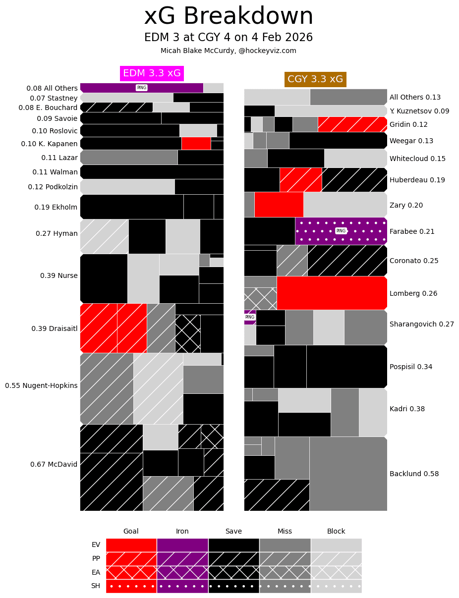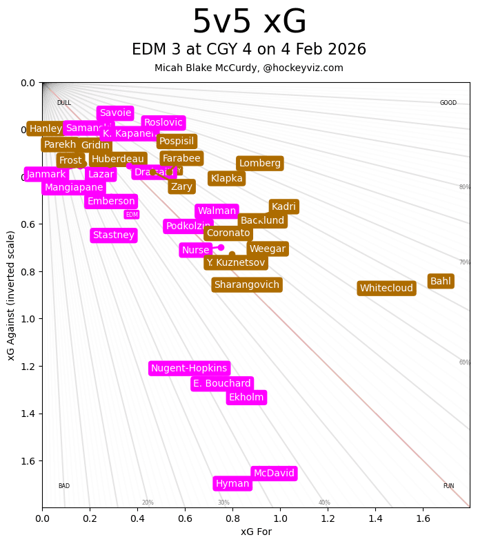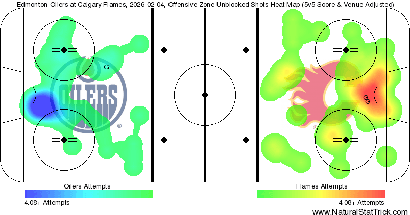 xGF% – Nazem Kadri (61.78 per cent) hitting a good stride as the Flames ride into the Olympic break is kind of bad timing. He is back to controlling most events that happen on the ice during his minutes, and the flood of offence is coming with it. Last time this happened it lasted around 3 weeks – of course for the Flames it starts paying off just before they shut down for three weeks. Jonathan Huberdeau (42.23 per cent) scored, on the power play, so here’s hoping that sparks something. They desperately need something more out of him down the stretch because he isn’t going anywhere, anytime soon. Matvei Gridin (31.11 per cent) had a breakout game on the power play. The 19-year-old with a goal and an assist – the offence is coming and the confidence is growing. I don’t think after he gets recalled after the Olympics, he’ll ever see the AHL again. Not this year for certain, but he’s ascending quite rapidly.