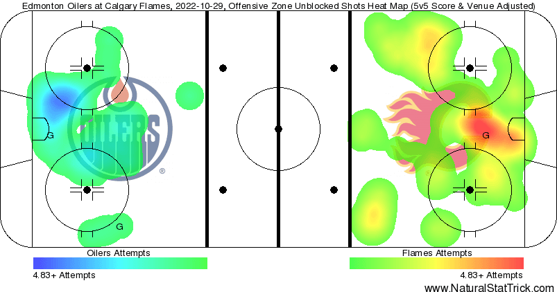 Corsi Clown – Because nobody was below 50% in chances. Every single player except for Kevin Rooney (60.81%) had double digits in attempts for while out. Last season this happened about five times and the Flames won by multiple goals each time it occurred. To do this in a loss is a bit of a strange occurrence.