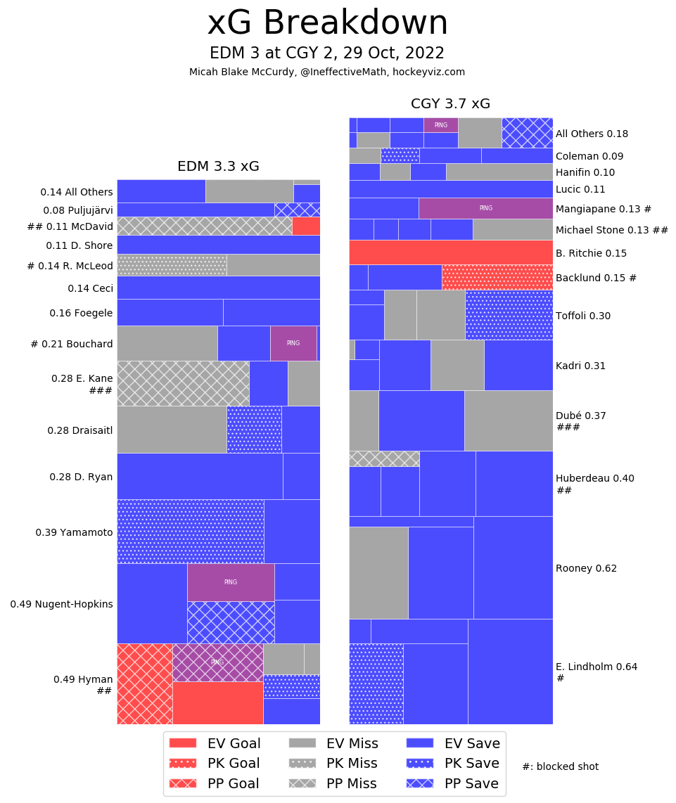 In The Crease – I mentioned in the intro that you always want your goaltender to play the puck if he can, but that doesn’t make the second goal against sting any less. For a team that was controlling pretty much everything it’s deflating for the fans, but the Flames did respond well. Then the puck takes a bad bounce into the slot and it’s 3-2 making that second goal sting more. It was a low danger chance, and the model says to stop it – that’s all the comments I’ll have on that because I couldn’t save an Andersson Hail Mary from the opposite end, let alone a wicked wrister from McDavid. 1.80 expected goals against at 5v5 with one high danger and one low danger chance going in.