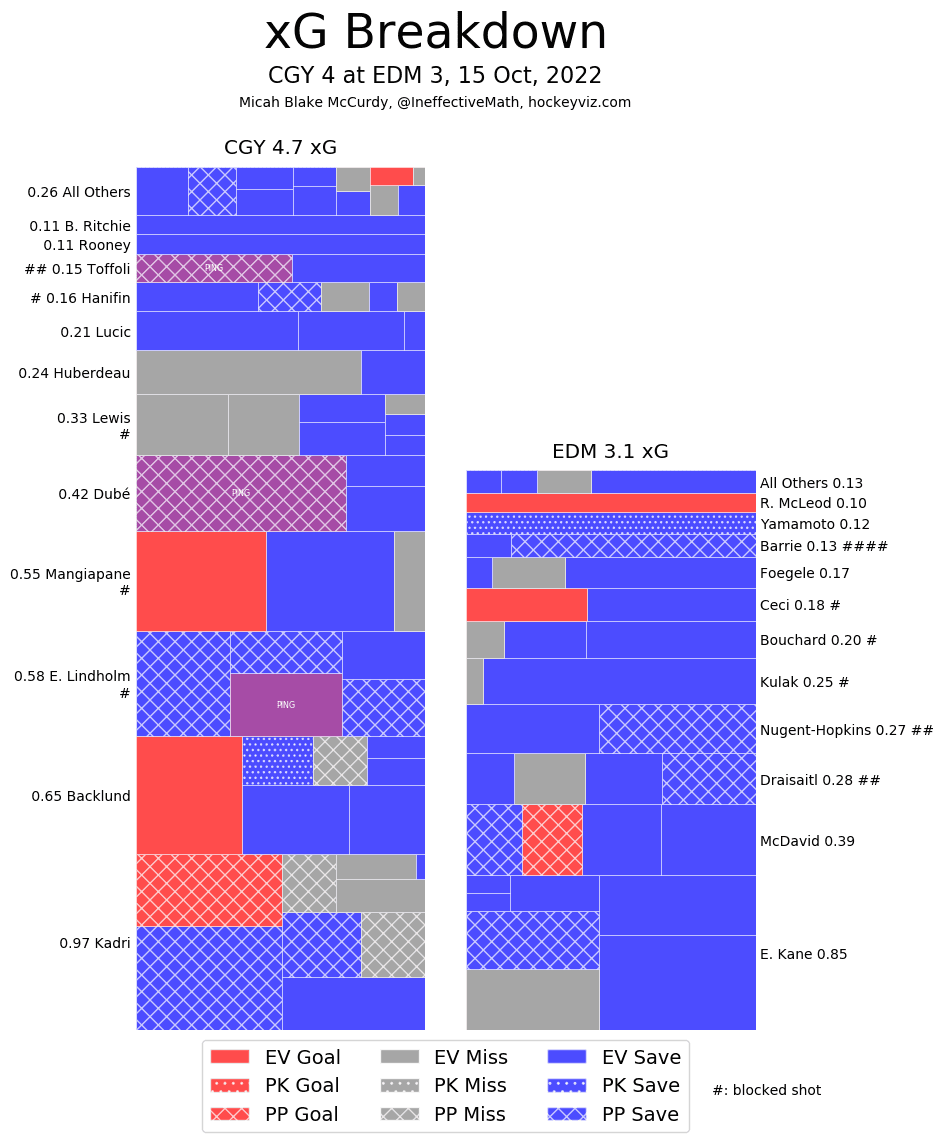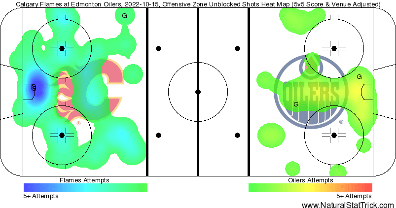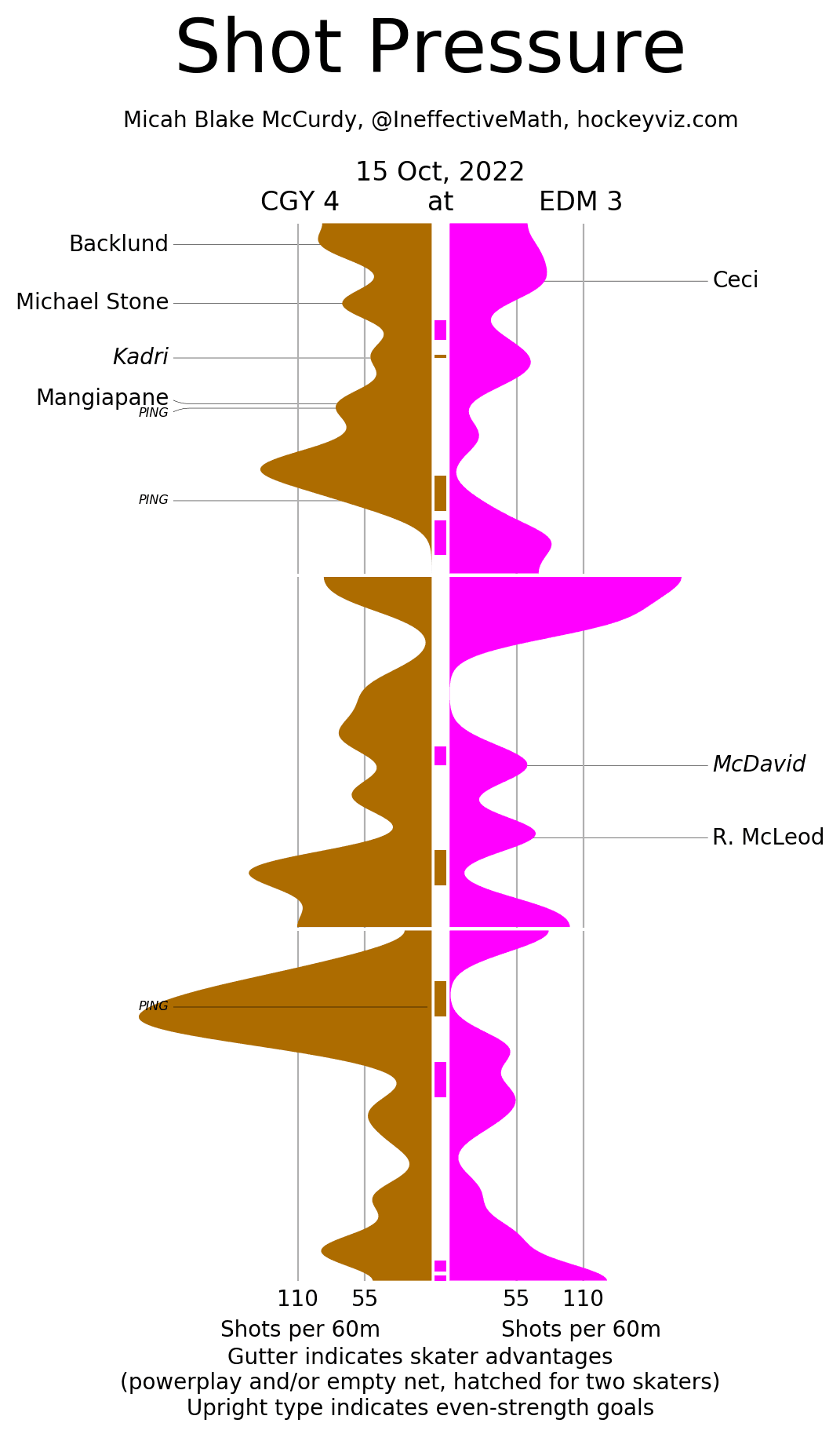 The Oilers really did come out all gas in the second period. Kudos to the Flames for surviving that and regaining control right after. Outside that start, all of the Oilers spikes in pressure coincide with having a man advantage (5v4, 6v5).