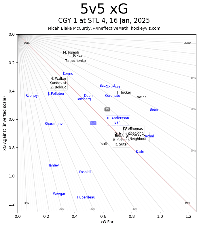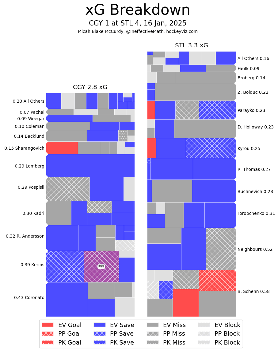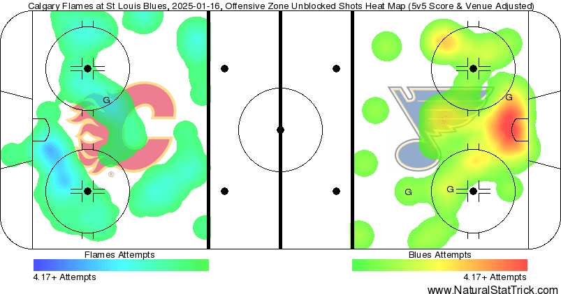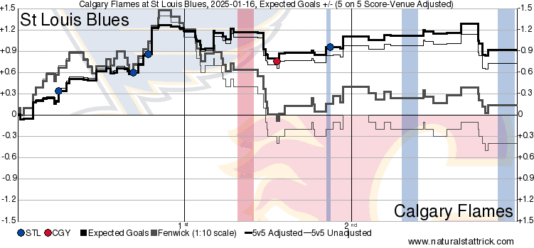 In The Crease – I didn’t like every goal against by Dustin Wolf in this match, but I was never going to like every goal he let in. Personally, the Parayko goal through minimal traffic was my least favourite. I felt the other two first period goals were largely due to the fault of a skater intentionally leaving their position and the Blues vacating that position to get a good scoring chance. Occupy old space worked twice in quick succession before the Flames woke up and started playing good hockey again. 2.71 expected goals at 5v5 with three getting past Wolf.