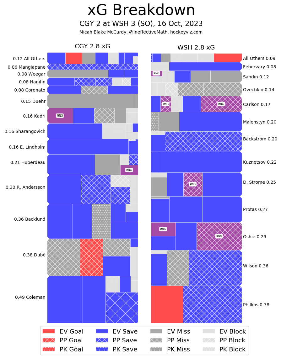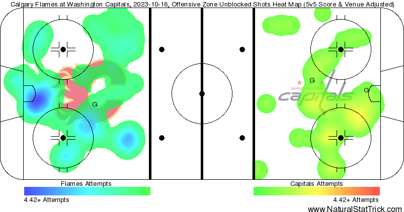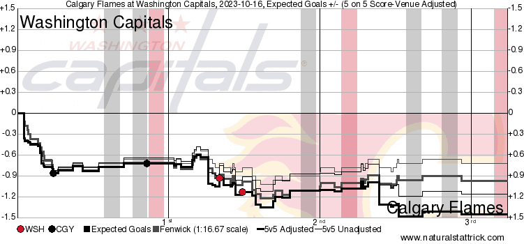 In The Crease – Markstrom was not busy at all facing just 18 shots. 1.34 expected goals against with 1 high danger and 1 medium danger goal against. The second goal appeared to take an odd bounce which could have messed with his tracking so I won’t be too overly critical. He kept the team in it to get a point and only got fooled in the shootout by Kuznetsov going 10 km/h below the posted speed limit. It was legal though so you have got to let that one slide – even if it annoyed you.