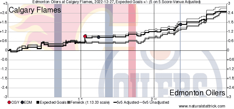 This was a game that from the drop of the puck was in the Calgary Flames control, the outcome though was all dictated by the Edmonton Oilers young goaler Stuart Skinner. Across the board by every metric Calgary was leading and lead every single period. They fell victim to the same problem they have had all year – a lack of ability to finish. It was well defended and definitely a game you can point back to as one where everyone was predominantly on the same page. We saw Calgary pass the puck better than they have all year despite the losing outcome.