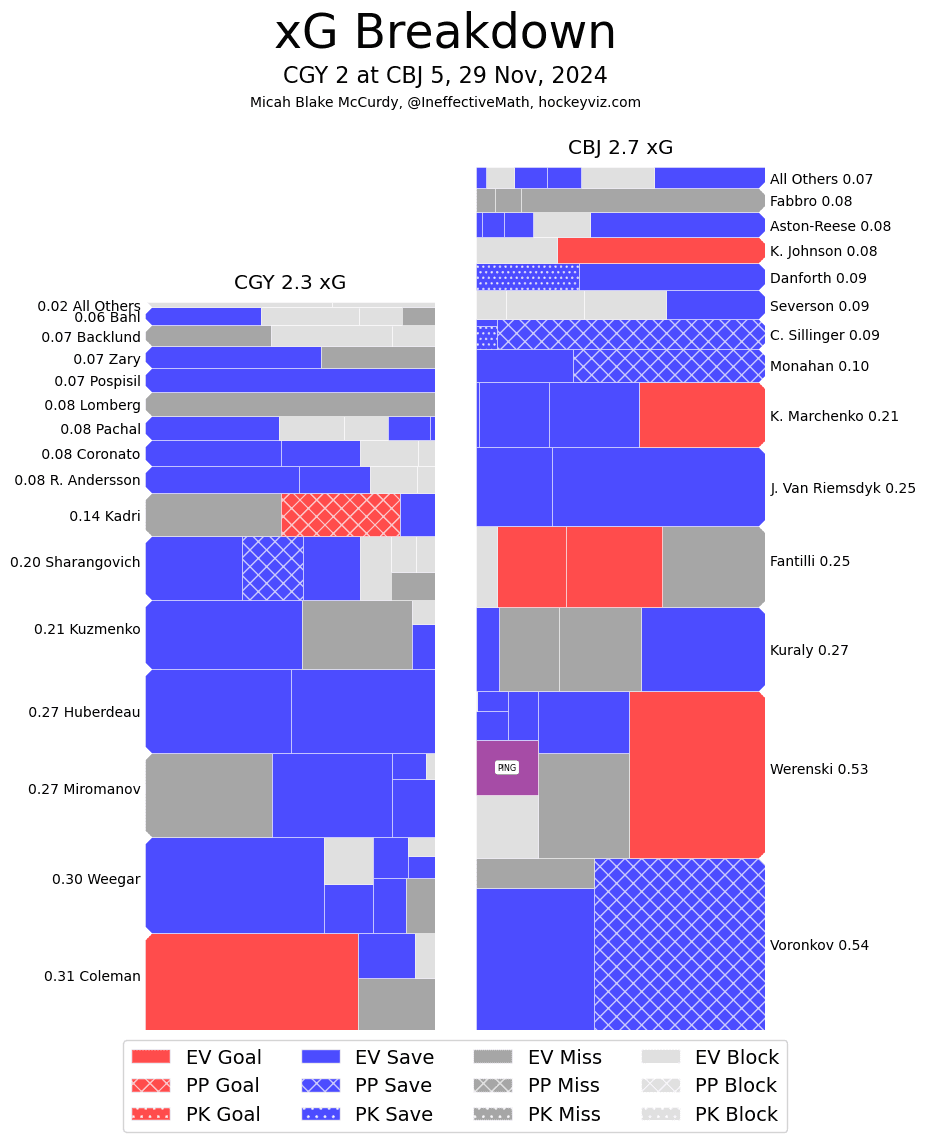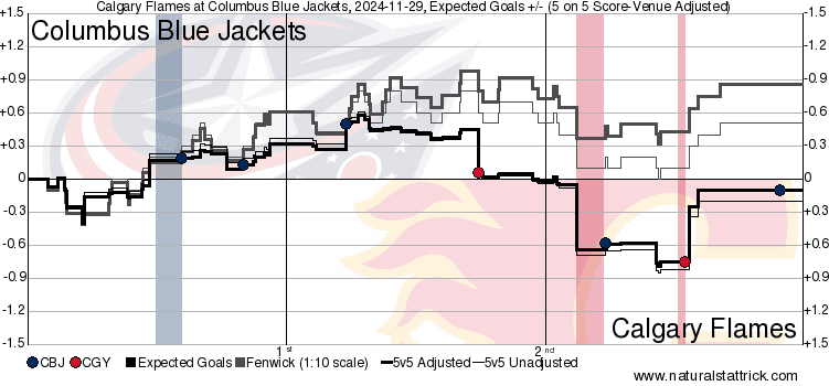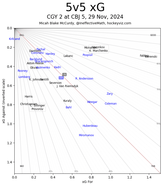 In The Crease – Not the best day at the office for Dustin Wolf, but not every game will be a win. He faced a higher than usual number of expected goals against at 5v5 as the Blue Jackets tried to go toe-to-toe with Calgary for chances. All of the goals against came from within the top of the circles so Wolf never got beat from long distance, just moderate distance. Not too worried about this one – everyone gave what they could.