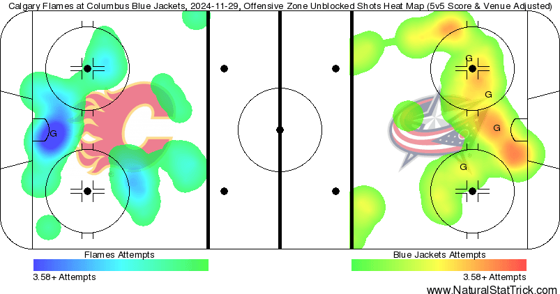 Corsi King – Top of the charts is Matt Coronato (72.46 CF%) who out attempted his opposition 20 to eight. More than half the team kept things fairly close here. Rasmus Andersson (51.61 per cent), Yegor Sharangovich (61.33 per cent), and Mackenzie Weegar (55.73 per cent) all were out on the ice for more than 20 attempts as well. The Blue Jackets were more opportunistic with their chances, but both teams had stretches of the game where they held momentum.