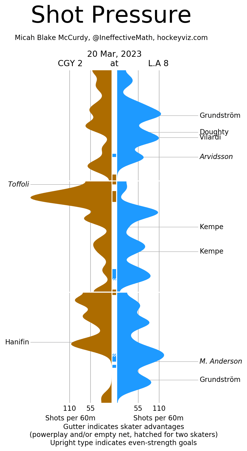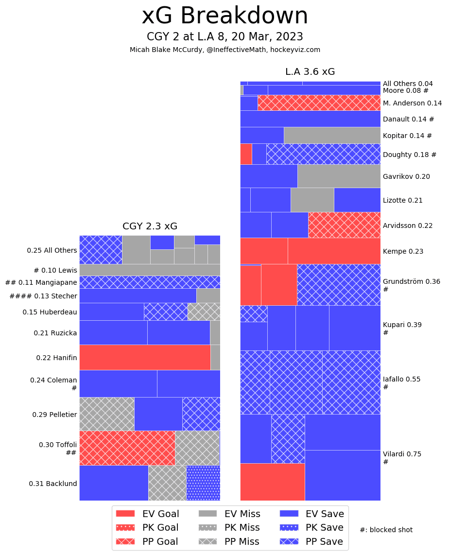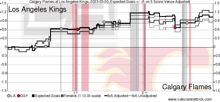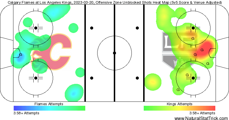 Corsi Clown – The score effects do change quite a bit of the ratios in this game – if you are curious please visit NaturalStatTrick.com for more. Lindholm (25.98%) was bottom rung with Mangiapane (30.57%) and Andersson (30.58%) right above him. Four of the Flames top four defencemen all finished under 40%. Everyone was quite bad, and the Kings were quite good. Remember, just because the all-situations shot attempts are semi-okay the quality is where you can find it gets much worse.