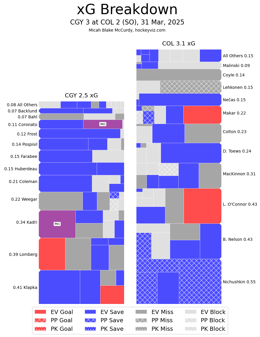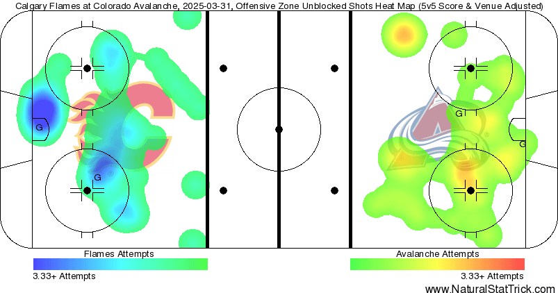 Taken By Chance – Mikael Backlund (58.12 SCF% || 100 HDCF%) has had enough games in a row back in the green for me to feel he’s back to his old self. The Flames really need him and his reliable minutes on the sprint to the finish line. He’s stringing together quality games whether the team wins or loses and that wasn’t happening back in February. The competitiveness of the team since he’s returned from the injury is a testament to the captain’s impact on everyone. After so many games as the hero Nazem Kadri (51.92 per cent || 0 per cent) got a tough task going against one of the deepest top six forward groups in the NHL. I was still on the edge of my seat when I saw him with the puck in overtime – this time of year you can always count on him to be dialed in.