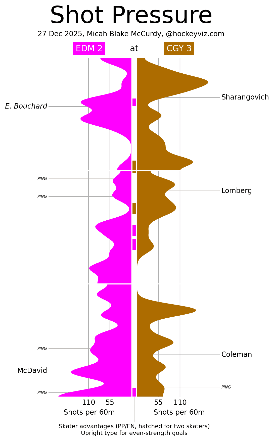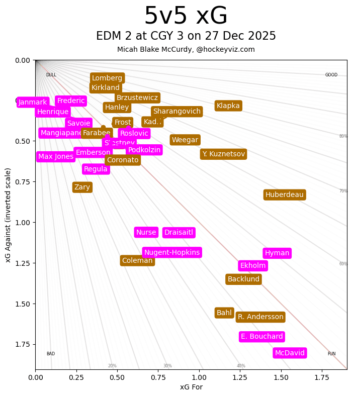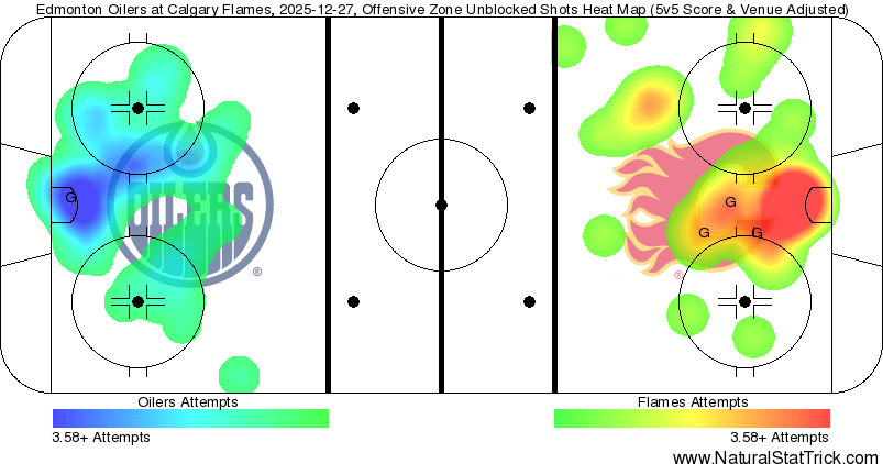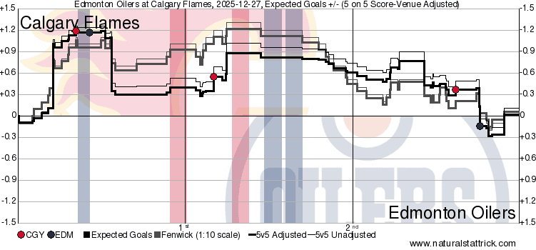 In The Crease – Dustin Wolf was his all-star level self in this one. Athletic, acrobatic, anticipatory, and amazing. 2.88 expected goals against at 5v5 and it took some McDavid magic to beat him. I do wonder how much the altering defence could adjust his numbers, but that’s a future problem. It’s just a refreshing sign to see him play like the number one goaler he is.