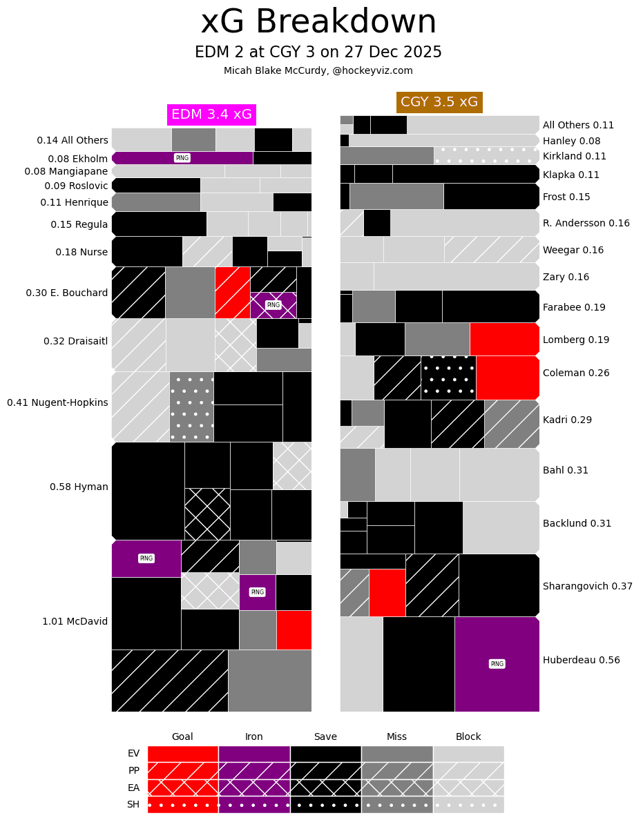 Taken By Chance – Rasmus Andersson (47.62 SCF% // 38.27 HDCF%) and Kevin Bahl (43.87 per cent // 28.79 per cent) once again gave it a good try, but the Oilers know how to get scoring chances. Their problems are not up front, at all, as evidenced by the fact this pairing surrendered ten high danger chances at 5v5. It wasn’t just them, Mikael Backlund (40.77 per cent // 35.72 per cent) and company gave up 7 themselves. All that is mitigated when they go in together to get the eventual game winning goal off a blueline turnover. Is the game plan perfect? No. Does it have to be to get the dub sometimes? Also no. They did their best against the NHL’s best and survived – win in my books.