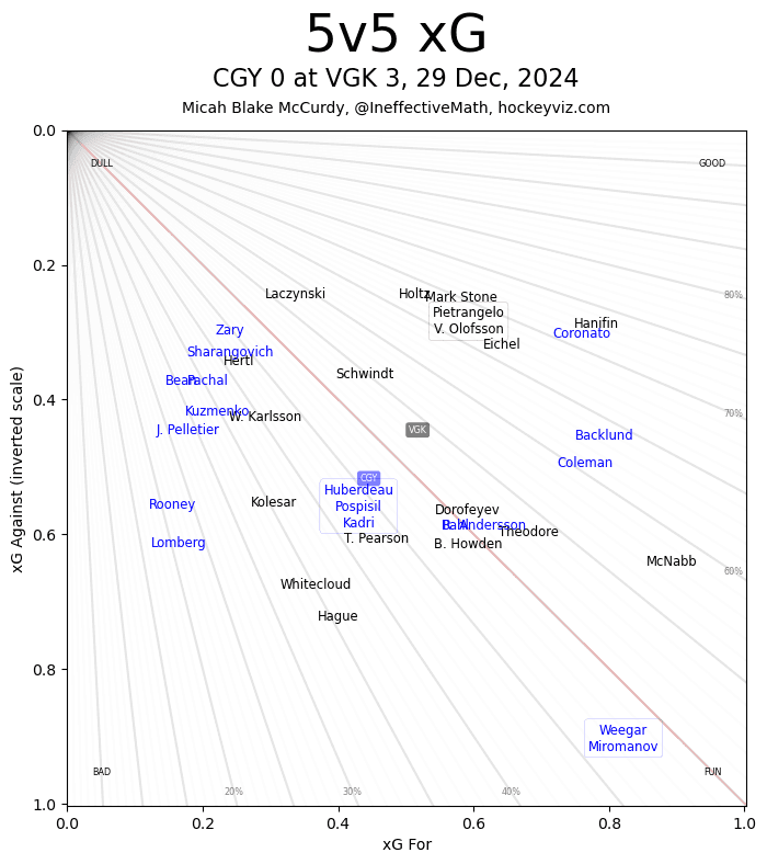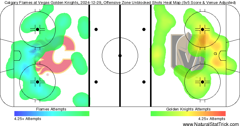 In The Crease – The Vladar show was on full display in Vegas. He was more than up to the task of going toe-to-toe with the mighty Golden Knights. He had to get to work early as Vegas pressed hard against the Flames. He made multiple stops on second opportunities and was in peak mental form. 2.05 expected goals against at 5v5 and only surrendered the one goal at that strength. It’s been such a treat to watch Vladar this season, he really has done a great job at pushing Wolf for a few more starts to make things even. It’s been a formidable tandem.