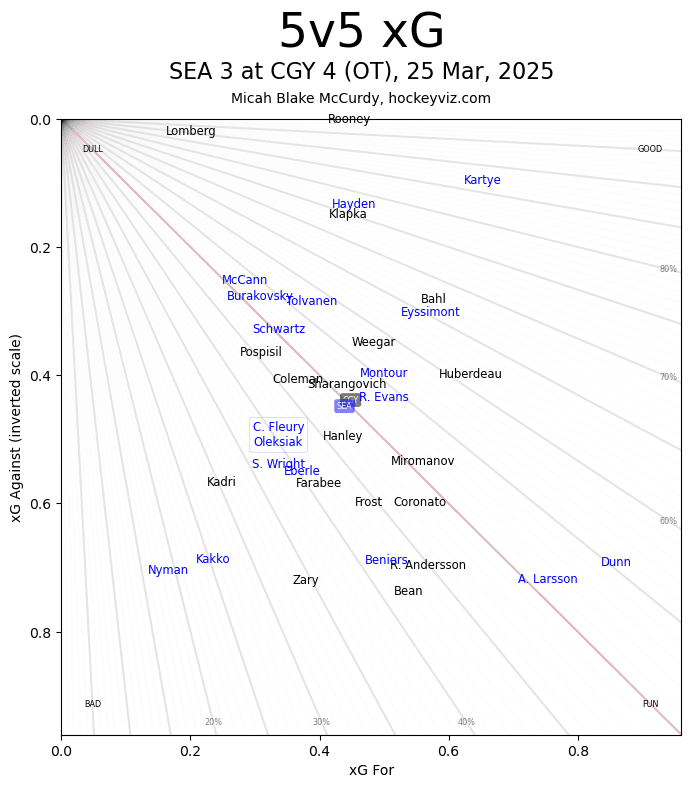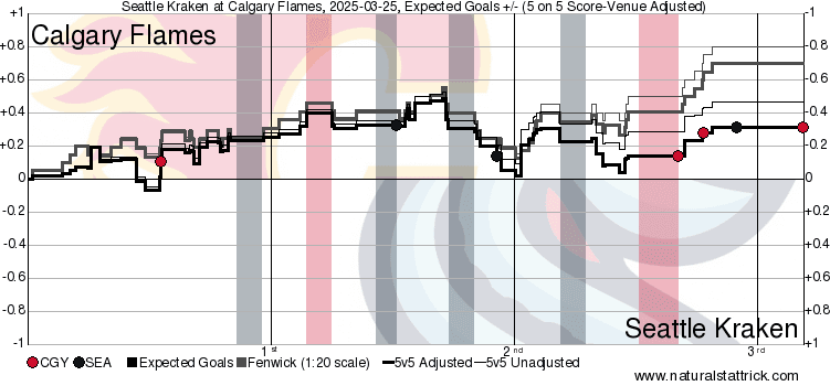 In The Crease – Dustin Wolf let in a goal I didn’t like, and it did not worry me for a second. I think the third goal he needs a better box out from his defence in front, but the second goal by Kartye I thought he lost his net a bit. Then again, the defence were in the area and failed to get a stick in the way or interfere with the shooter, but I felt Wolf has stopped those 99% of the time all year. Nobody’s perfect and it didn’t lose them anything, so it’ll be forgotten by the time I start to cook dinner the next day. 1.31 expected goals against at 5v5 with one goal getting past him.