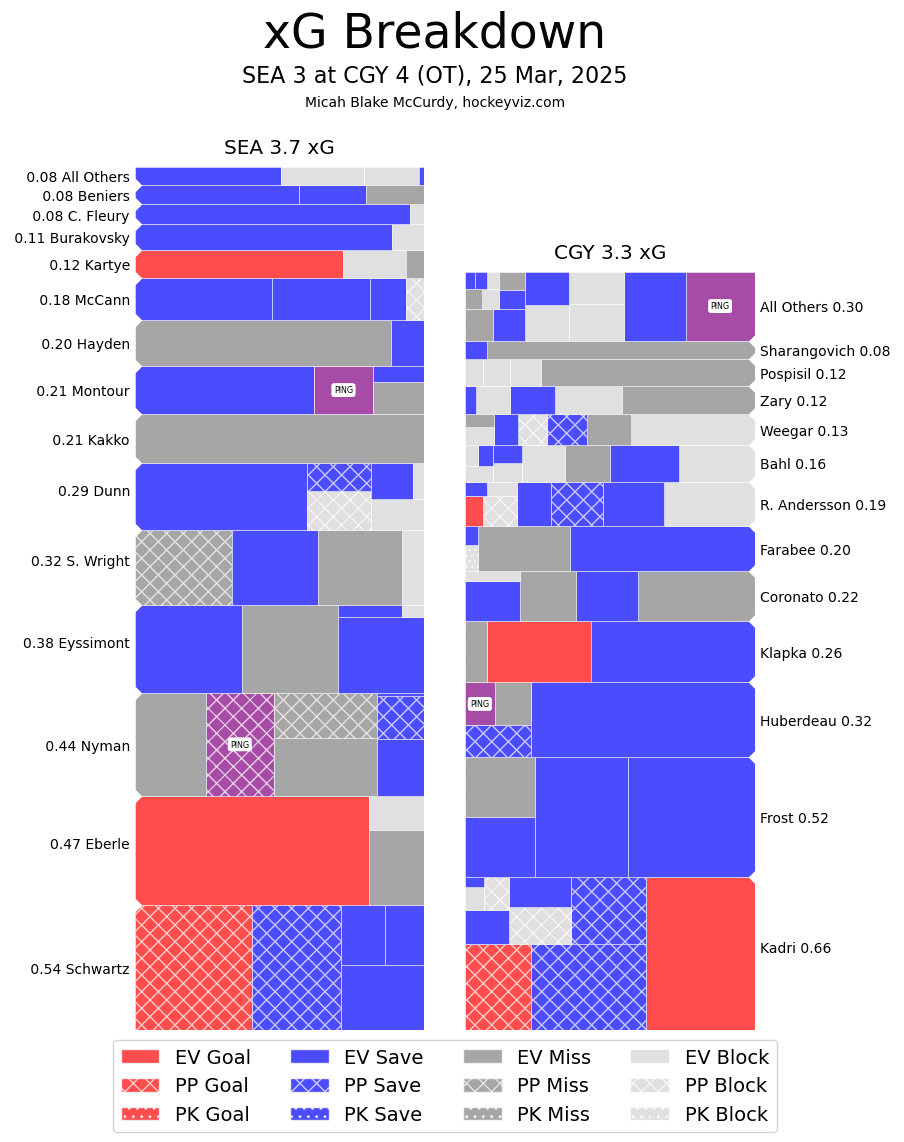 xGF% – Rasmus Andersson (57.31 per cent) became the talk of the FlamesNation work Slack on Tuesday because of the contract signed by Jacob Chychrun of the Washington Capitals. In this game he displayed all of his massive positives – offensive skills, booming shot, willingness to block anything – while also losing positioning on Eberle to allow the tying goal. There was an instance where he could not catch up with a forward who broke away from him for a good scoring chance as well. I think Andersson still does enough good that he should be considered as a piece for this team, I just do not believe the cap number that properly represents his contributions needs to be anywhere close to Chychrun’s number. With an inflating cap the number should be higher, but nobody on the blueline has shown to be more valuable than MacKenzie Weegar (53.35 per cent). Using his percentage as the blueprint for where to go with Andersson’s contract should be the play in my opinion.