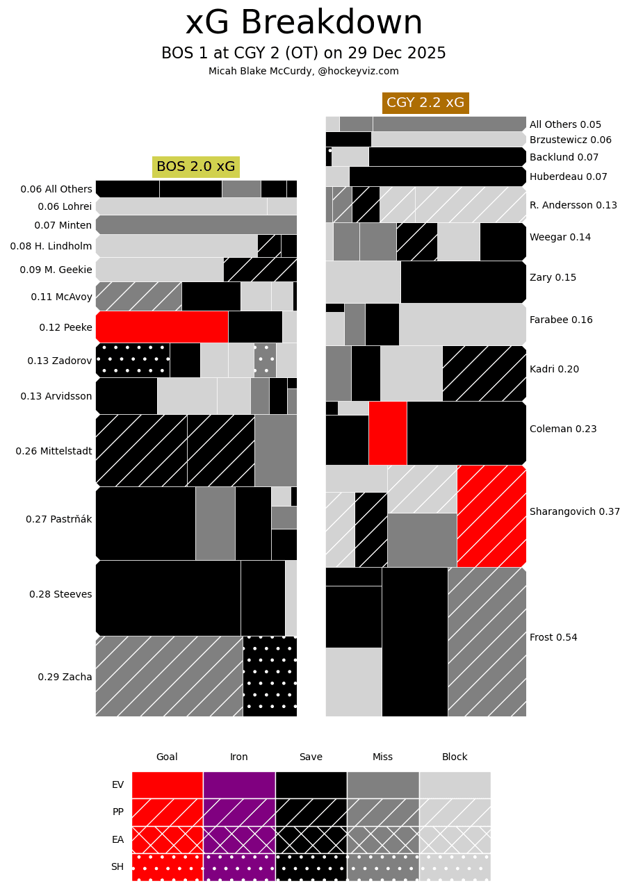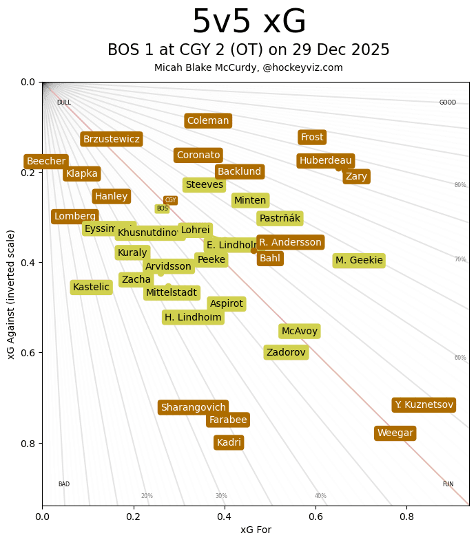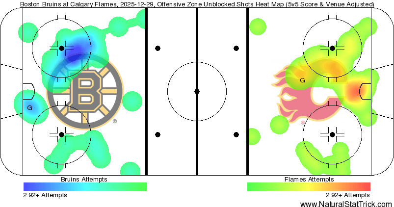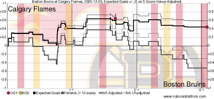 It’s a Team Game – This was not a high event game – it was a gritty defensive battle amongst two teams that have had trouble generating offence at times this season. High danger chances ended up being 6-6 while the expected goals were 1.5 to 1. Just not a lot going on in any given period. My favourite period had to be the first. Calgary had a strong start and finish to the opening frame, generating the most high danger chances in the opening 20 minutes of any of the three periods. A stark contrast from the third period where they weren’t able to generate any. The Bruins only got one in the third themselves in what was one of the lowest event games of the season.