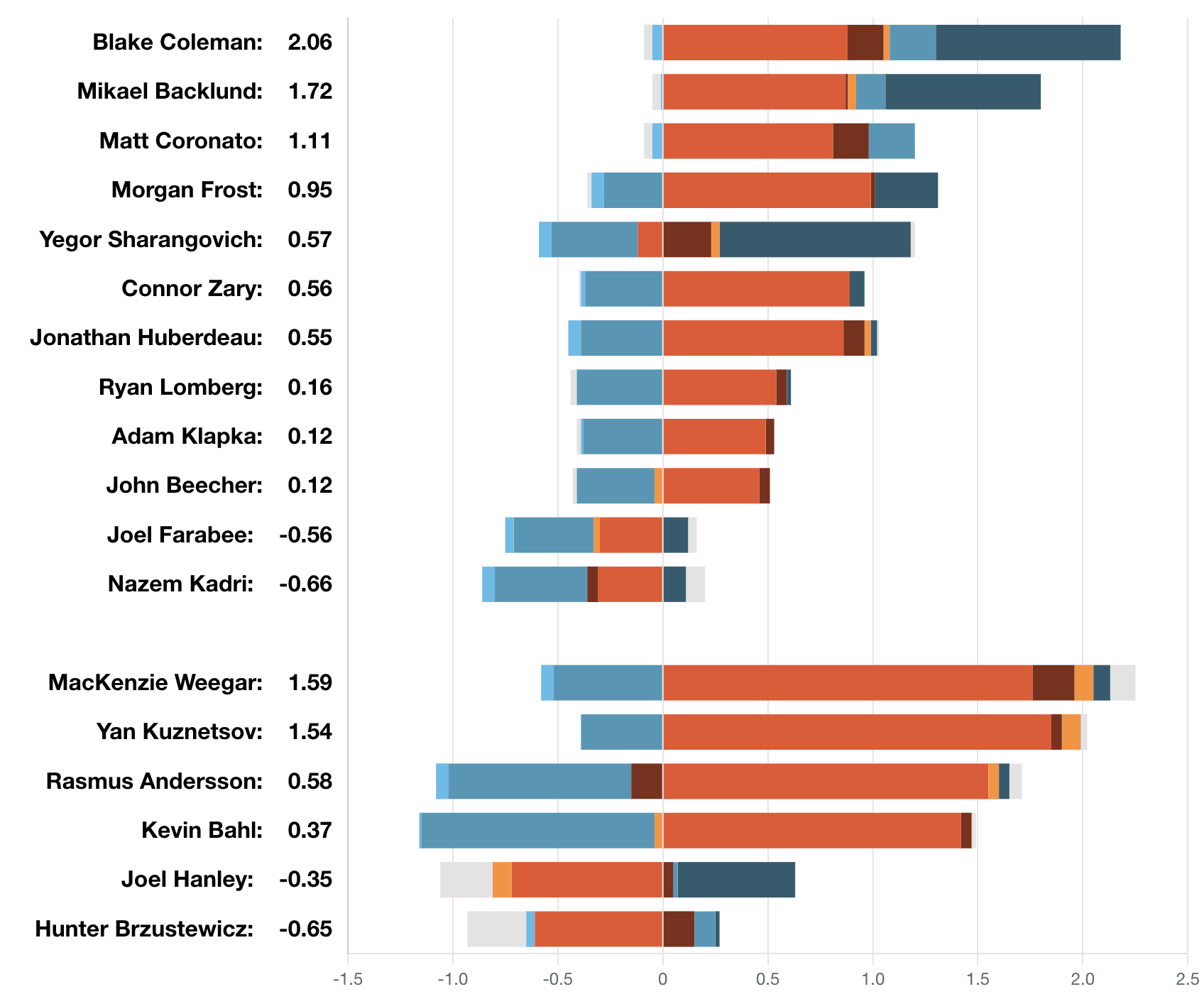 xGF% – As of writing this the overtime goal has been awarded to Connor Zary (76.37 per cent), but as the shot pressure shot shows us the league has been bouncing between whether he touched it, or it just bounced in after Yegor Sharangovich (49.03 per cent) shot it. Either way having those two guys involved in the game winning goal is great news for this squad. They had incredibly cold starts, close to frostbite levels of cold, but they kept working at things and are starting to persevere. Consistency outside of a few guys has been the most common issue plaguing this team – getting some regular scoring could send this team farther than many have predicted, myself included.