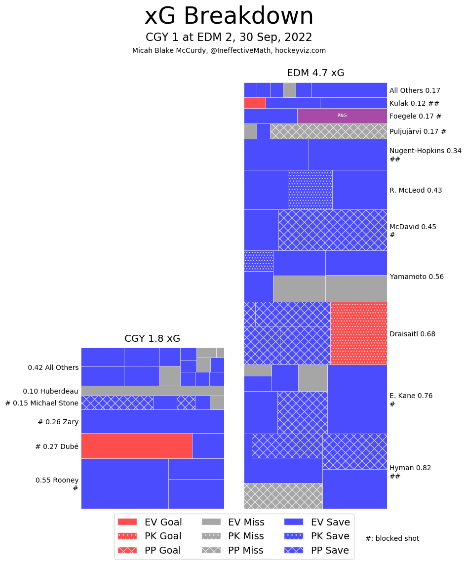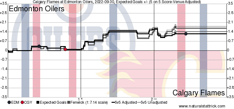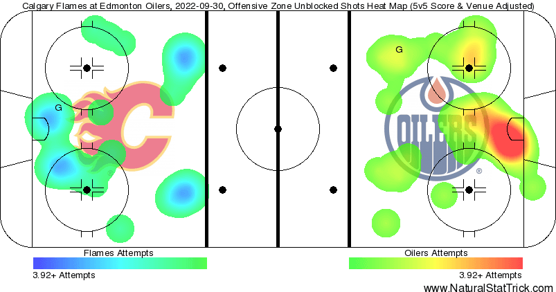 Corsi Clown – Jonathan Huberdeau (23.36 CF%) went up against the top Oilers without Kadri, Lindholm, or Backlund dressed. He was given Adam Ružička (24.25%) and it just didn’t work out. It’s only one game but barring a plethora of future injuries Ružička won’t be put in a spot like that in the regular season. Juuso Valimaki (28.06%) paced the defence in overall attempts against.