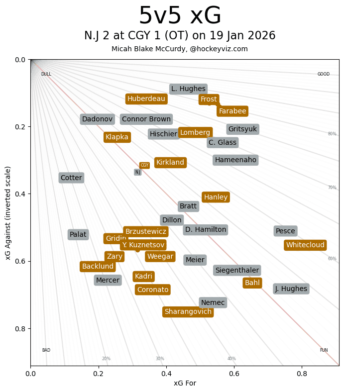 In The Crease – Devin Cooley was a rock yet again. He made some top-notch saves, got the game through 60 minutes, and bit on a good fake by the Devils in overtime. Oh well, from the goalie side of things there was zero concerns. Start Cooley whenever you feel like it because he’s earned plenty more starts than I ever expected before the start of the year. What an ascension. 2.02 expected goals against at 5v5 with just 1 getting by him.