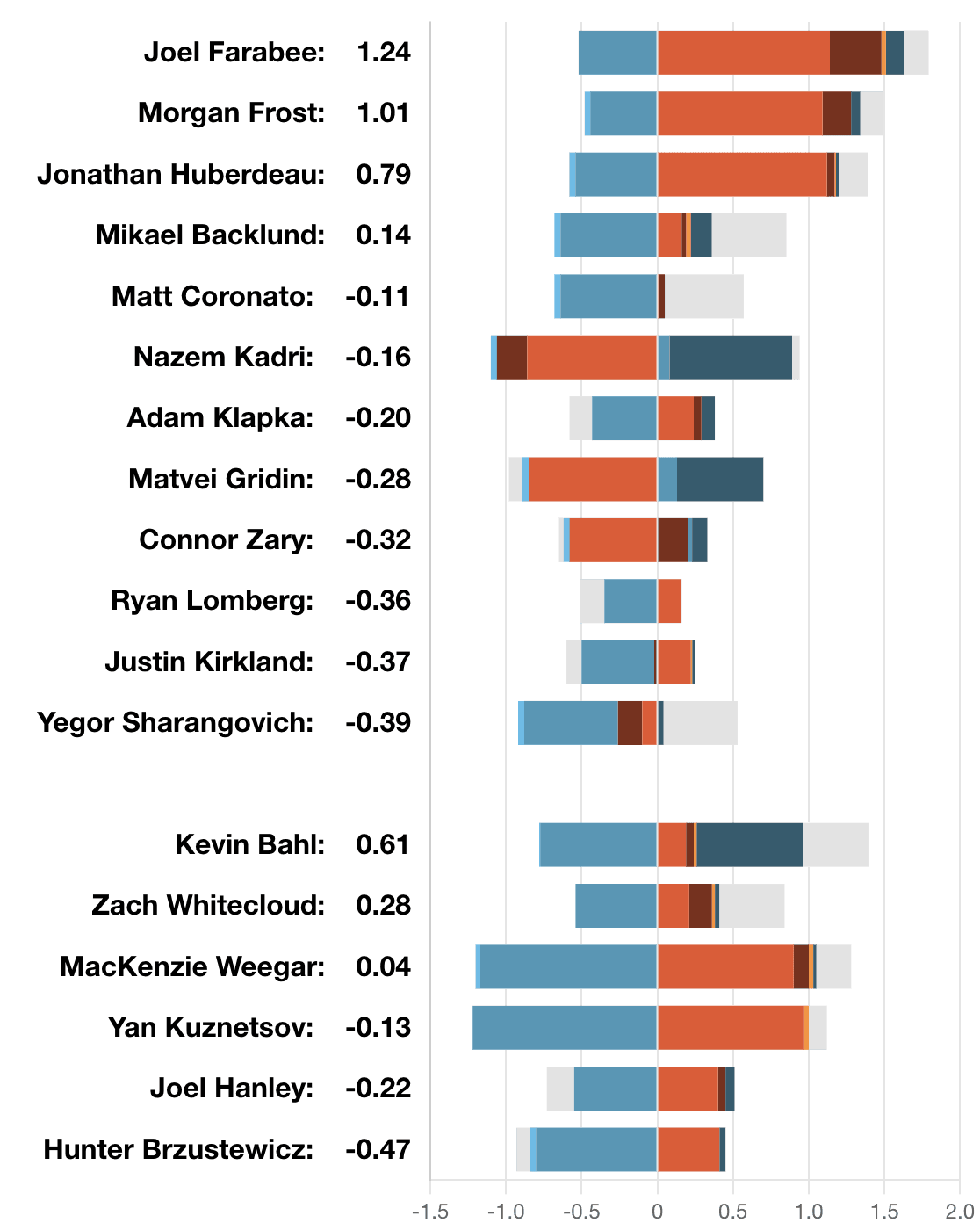 Corsi King – Morgan Frost (64.91 CF%) and Jonathan Huberdeau (62.94%) both had a +4 advantage in shot attempts for/against. Zach Whitecloud (55.04%) led on defence going 16/13. They have decent numbers together overall, one of them should decide to be a shooter when together. I saw Frost pass up a great shooting opportunity again tonight for that extra pass – if the pucks already coming to you in motion let it fly. Of course I’m talking off the rush, please don’t default into just taking point and perimeter shots. He’s not the only one – the whole team needs a lot more drives/cuts to the middle of the ice and a better willingness to drive the puck right to the crease. Make a play, find some space, rip a goal.