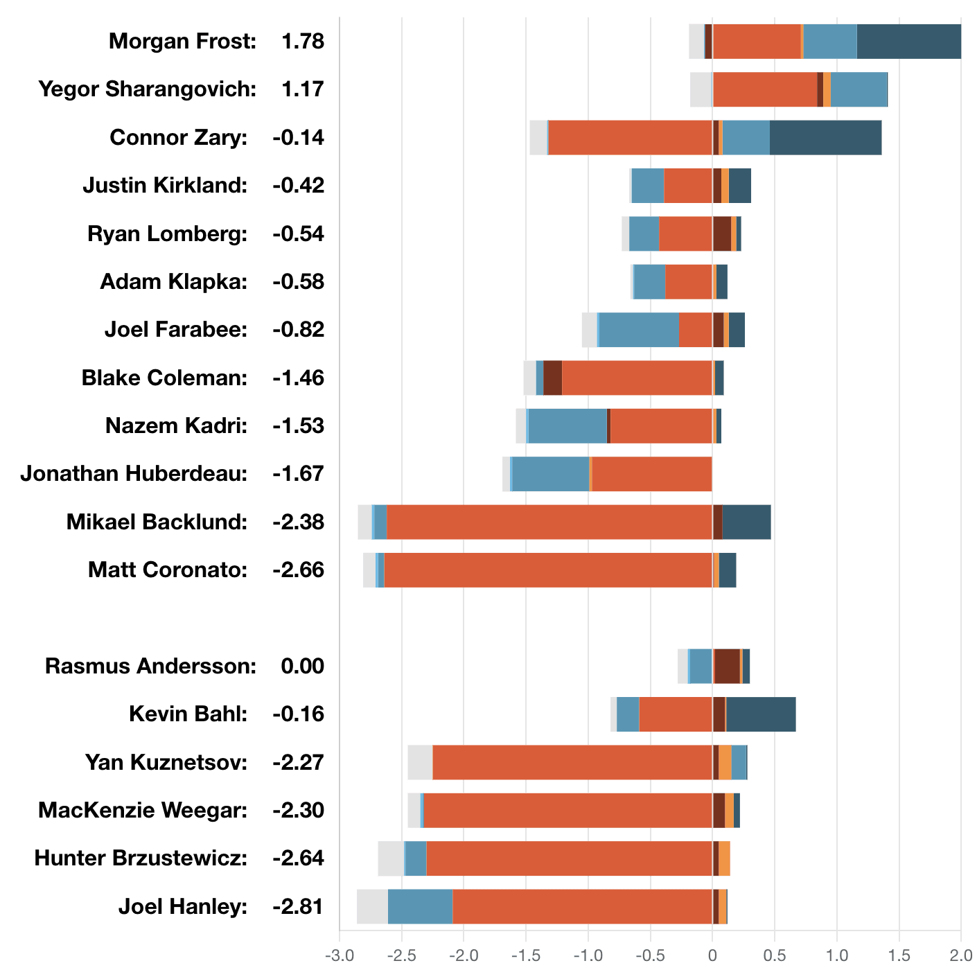 Taken By Chance – Positives – Yegor Sharangovich (55.62 SCF% // 100 HDCF%) and Morgan Frost (61.06 per cent // 100 per cent) both finished with a 1-0 goal advantage and no high danger chances against. Of course, that goal was a complete solo effort from Connor Zary (34.84 per cent // 35.29 per cent) that neither were involved with in any significant way. Frost got an apple on it, but Zary came around the corner, saw a hole in the coverage, drove the net and put it home. MacKenzie Weegar (37.19 per cent // 31.53 per cent) and Yan Kuznetsov (40.43 per cent // 37.69 per cent) got caved in with double digit high danger chances again for the second time in a week. That pairing’s reputation is riding very high on their early success together, but in recent weeks they’ve faltered quite a bit. I’m okay with it, because it’s giving a rookie valuable minutes to learn and grow in the future. However, It is still worth pointing out they’ve been struggling.
