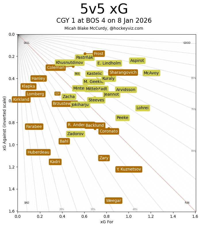It’s a Team Game – I’m going to start to sound like a broken record in these, but the Flames have just flat out been not good enough since hitting a .500 record. Tonight, their defensive coverage – specifically at their own blue line – led to multiple goals against. The Bruins found space to walk right in, pass enough times to confuse any goaltender through all the open seams in the mixed coverage, and tickle the twine. For the Flames, the second period continues to be their strongest, but the third period collapses in 2026 have been concerning. Boston had a 7-1 advantage in the final frame as they had a large enough lead to lock up the middle of the ice and keep the Flames attack to the outside. 4 straight regulation losses after that absolute grind to get back to relevancy just feels like a nail in the coffin for these guys who continue to struggle to score goals. Just 3 scored in their last 3 games – the attack tonight was not one that inspired thought this group is going to bust that slump anytime soon.