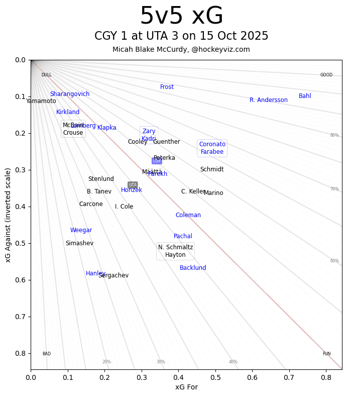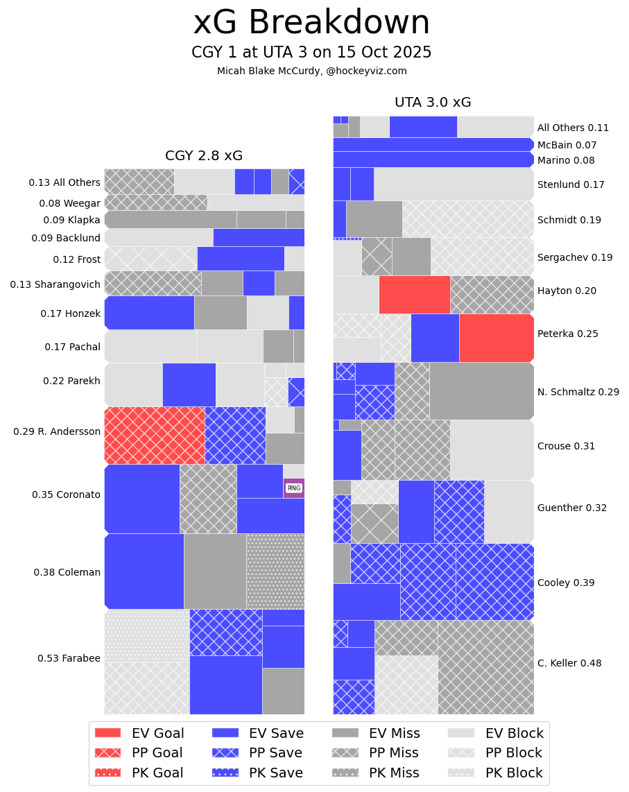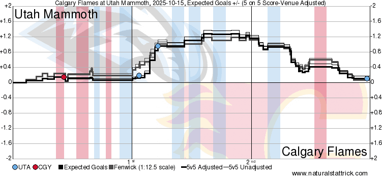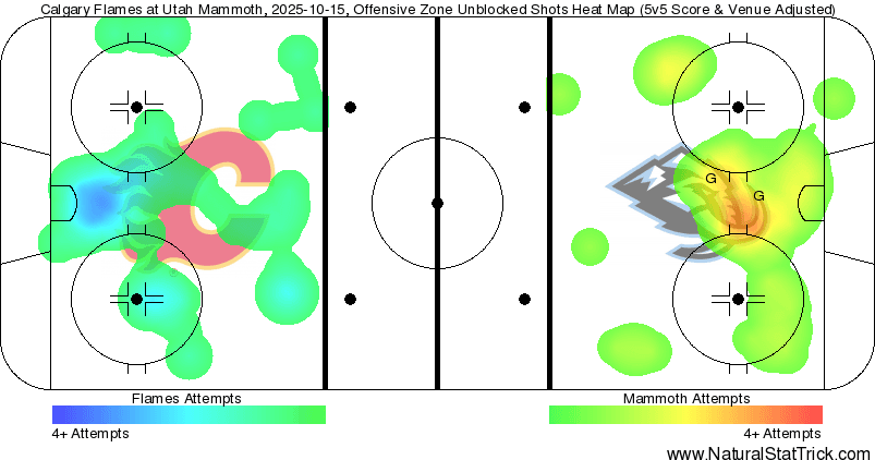 Also, analyzing 5v5 play in a game that was consistently broken up by a parade to the penalty box for the Flames is hard. Lines stay mixed and it’s hard to get into a flow. The Flames penalty kill deserves a tip of the cap, and Devin Cooley too, tremendous work from that group that led to Calgary even having a shot in the third period.