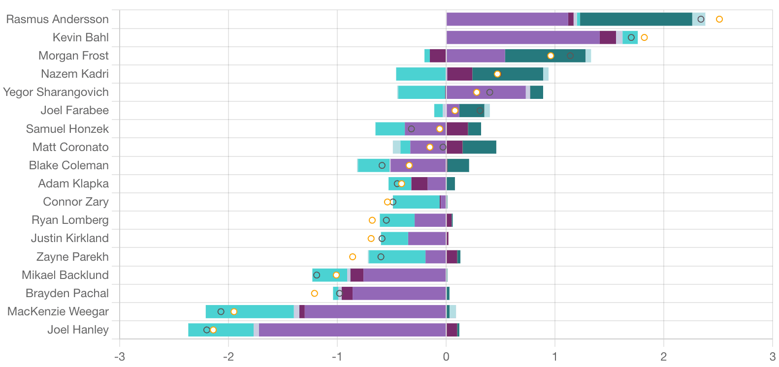 xGF% – I have been quite lenient on Nazem Kadri (37.01 per cent). He’s been noticeable on offence, but nowhere near the level this team needs him to be at. With Huberdeau out it’s got to be him that stirs the drink of this offence. They need Kadri to find some net and really dominate his shifts. His linemates keep shifting, but something has got to stick for a while eventually. The other centre in the top 6 – Morgan Frost (85.88 per cent) – is clicking at a high level. Spending most, if not all, of his 5v5 ice time pushing play into the attacking zone. It was a nifty tuck pass inside the driving lane that led to Andersson’s (72.20 per cent) power play goal. I think if this continues he’s going to start finding more guys open with better shooting opportunities.