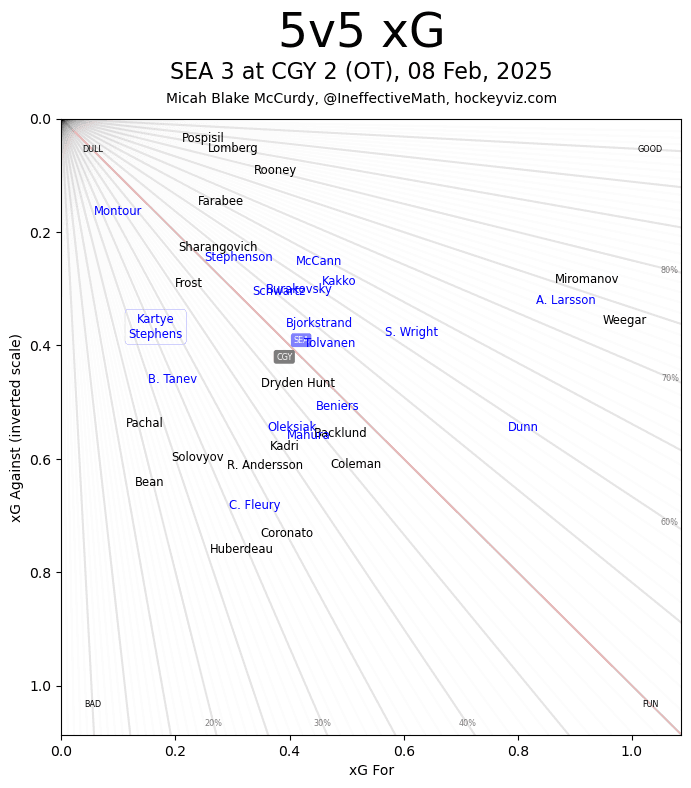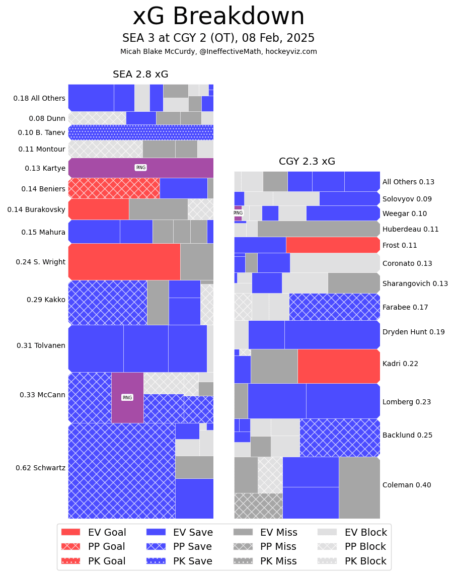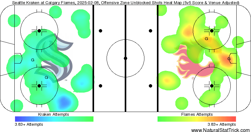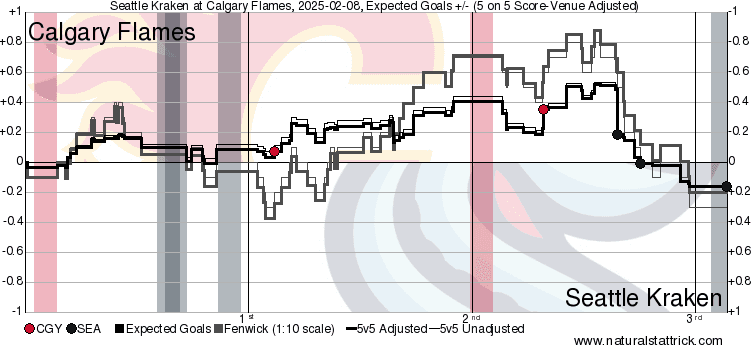 Taken By Chance – In the middle of the game the announcement for the final team Canada roster spot came down with the honours going to Drew Doughty. A great player in his own right with a Hall of Fame history – can’t dispute the two cups, the Norris, and the Olympic gold. If this was on recent play though, MacKenzie Weegar (67.71 SCF% || 71.88 HDCF%) would be a lock. The 4 Nations Face-Of is an NHL sanctioned event though, not the true best-on-best that Olympic hockey brings us, so taking the established star from an American market is understandable. I just hope Weegar knows he deserved to be chosen. Tonight, he basically did all of the heavy lifting in his minutes as I watched Miromanov (74.80 per cent || 82.26 per cent) make ill-timed pinches, lose his positioning off the rush, and genuinely fail to deny zone entries. None of it ever gets too exposed because Weegar has always has his partner covered. If he could get a reliable defence partner, he could start to focus on offence as well. Ilya Solovyov’s (44.70 per cent || 39.49 per cent) first game after the call-up looked alright. If the wingers would stop failing to clear the defensive zone so often the defence would look a good chunk better.