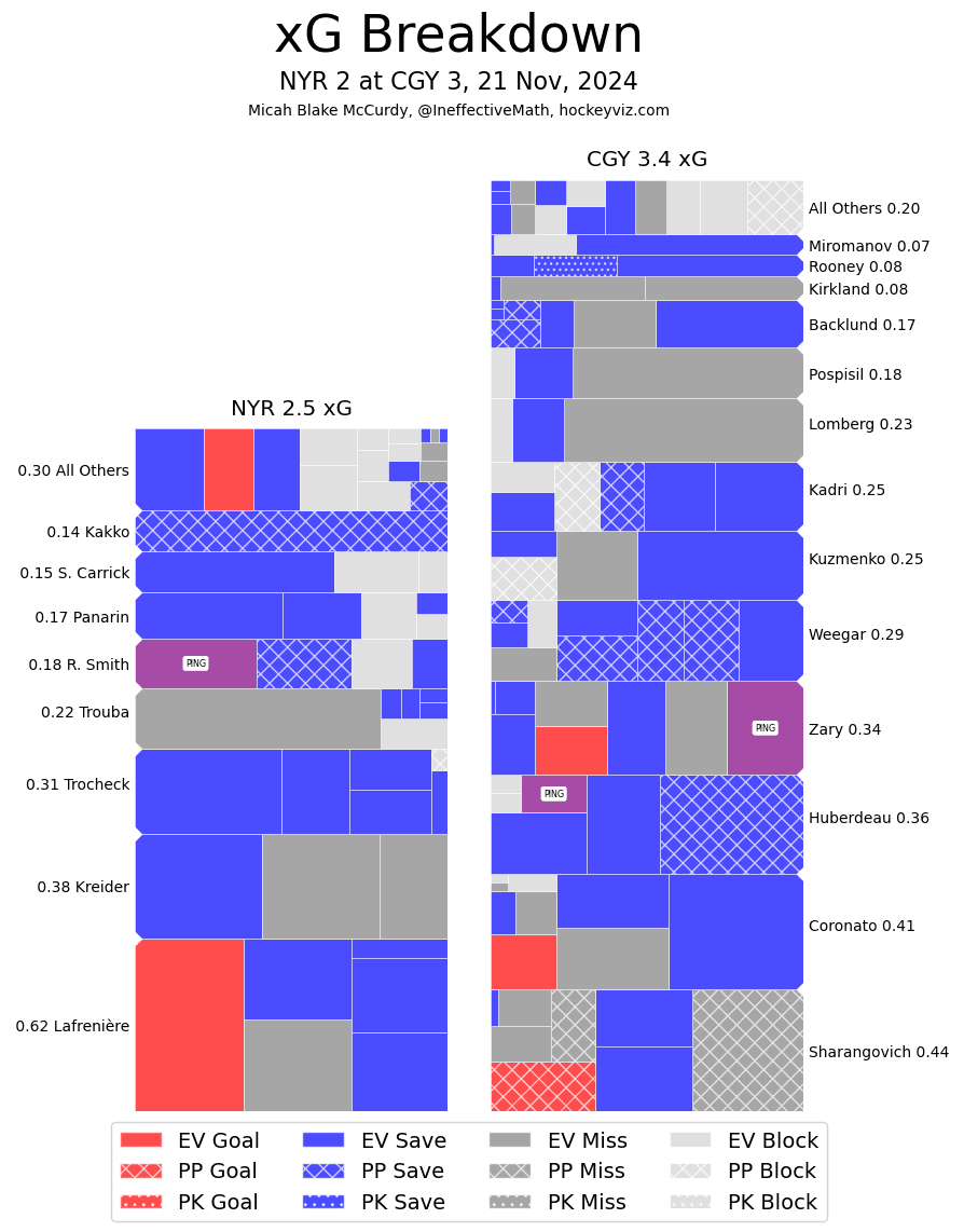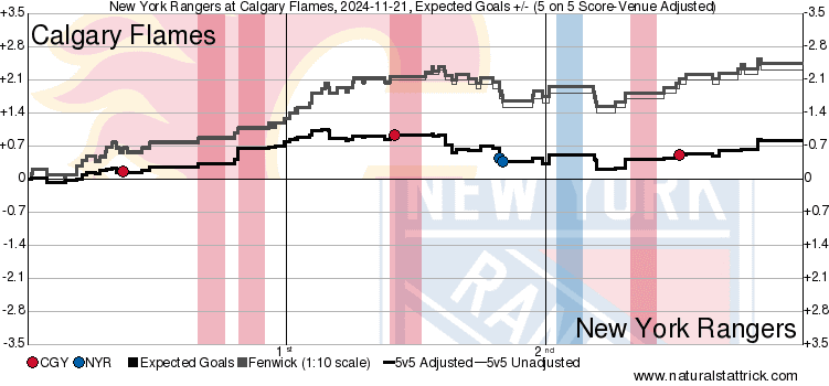 It’s a Team Game – The final team stat line is one of the most unique I’ve come across yet. The Flames dominated shot attempts, reaching over 30 shots on goal before the halfway mark of the game. Yet, the Rangers found a way to recover and push back after being thrown onto their heels. Dustin Wolf bounced right back from the two quick goals against in the second period to shut down the Rangers the rest of the way. In my opinion, Calgary really deserved this win in one of their strongest efforts of the season against a high-quality Rangers team.