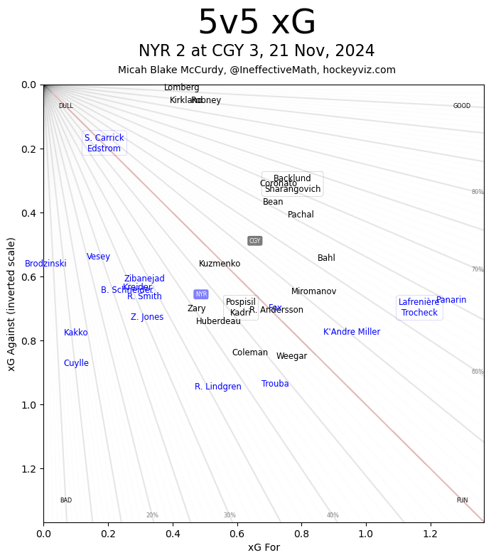 (Stats compiled from Naturalstattrick.com // Game Score from Hockeystatcards.com // xG and Under Pressure charts from HockeyViz.com // Game Flow and Shot Heatmap from NaturalStatTrick.com)