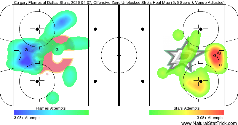 Taken By Chance – This is a game where Calgary lost their most reliable defenceman early in the 1st period, and two guys had to really pick up the slack. That’s no problem for the Calgary Flames version of Olli Määttä (46.23 SCF% // 52.77 HDCF% // 6 high danger chances for) who, out of nowhere, decided to become an offensive defenceman. It’s not just in the numbers either, some of the passes he’s executing in transition are nasty to watch. The other gentleman that shouldered the load was other newcomer, Zach Whitecloud (50.20 per cent // 62.99 per cent). Anchored by two guys who were on other teams in 2025, but contributed to the Flames pushing the Stars to the brink. The new guys are pretty alright, which gives Calgary at least a quality base level for their rookies to try and grow to (but hopefully grow right past).