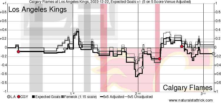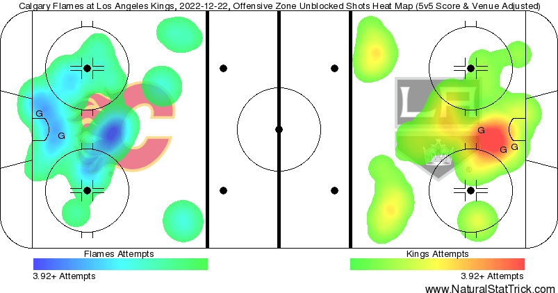 Taken By Chance – Chance battle was not even though – the D pair that was middle of the road in CF% got buried in high danger chances. Zadorov (46.30 SCF% // 21.89 HDCF%) and Stone (46.30% // 27.09%) saw four times as many high danger chances against as they were on the ice for. Tanev (29.64% // 30.70%) and Weegar (25.26% // 30.70%) also being buried is a good way to show that Calgary getting one point is a semi-fortunate occurrence. The LA Kings won the depth battle in possession and quality of chances, Calgary wasn’t controlling anything like they did against San Jose.