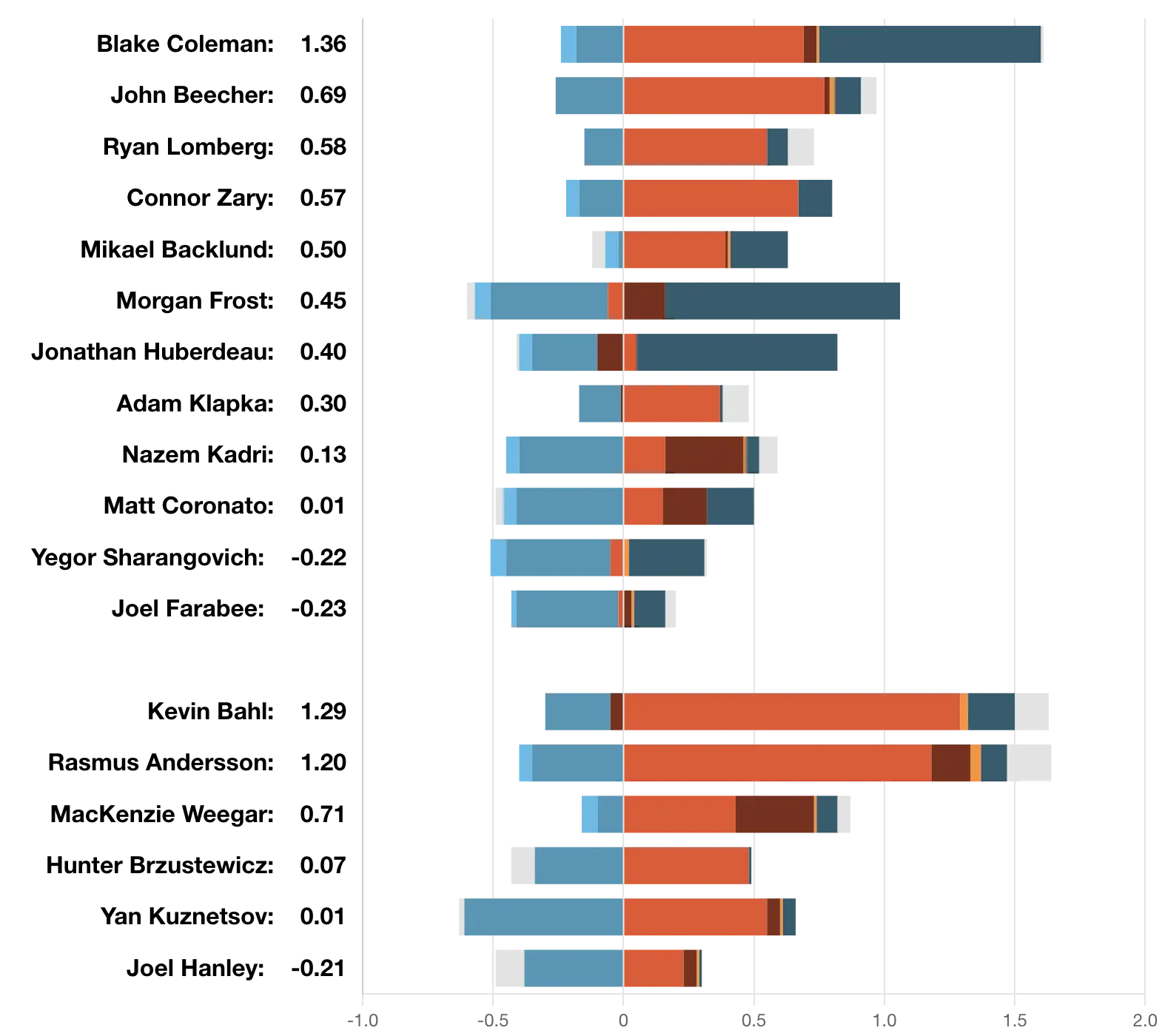 Taken By Chance – Kevin Bahl (53.93 SCF% // 67.83 HDCF%) was noticeable at times in the offensive zone. Not in terms of creating chances, but there were multiple instances where he kept the play alive with good puck protection and cycling instincts. Usually I praise his partner, but when defensive ability is the story of the day why not give him a shout-out instead. It was another night of give and get with Nazem Kadri (46.86 per cent // 46.57 per cent) who gave up as much in high danger as he was able to achieve. I’m fine with this, so long as those offensive opportunities stay present in his game. Calgary needs him to produce offence almost nightly. Wolf can’t stop everything, every night – they need goals and they need Kadri to get one a game.