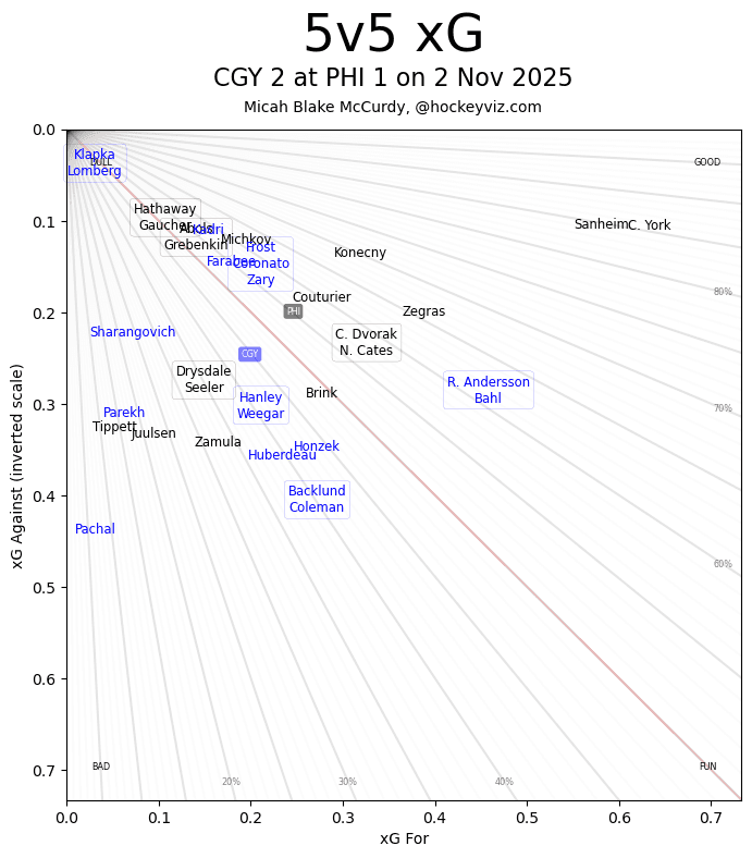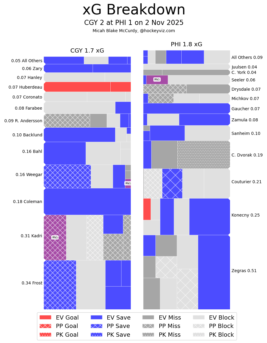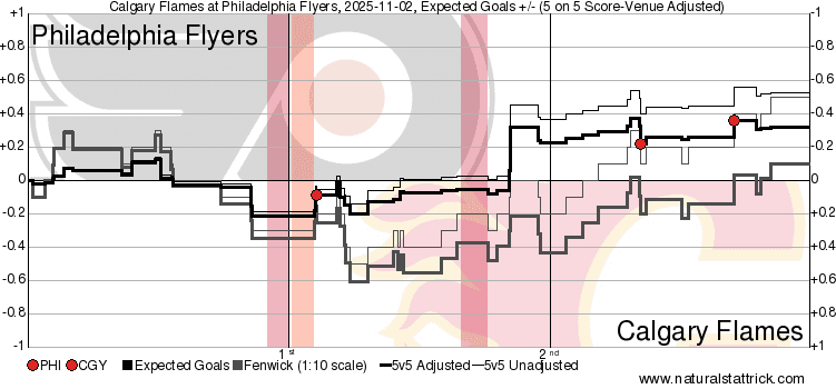It’s a Team Game – I’m not going to take the time to check all the other games that have been played so far this year, but this one has to be a contender for the game where the least amount of were attempted. Would I say it was a defensive clinic? No – it was more like two teams who struggle to generate offence doing just that, struggling. Most of the game was played at 5v5 and high danger scoring chances were 6-4 in favour of the flyers. Overall scoring chances just 14-12, again favouring Philadelphia. Not a lot there and the final score really reflects the overall number of chances that actually occurred in the game. The Flyers themselves aren’t offensive juggernauts, so it was good to see the Flames – who have in fact structurally been a sound 5v5 team – get a victory in the end.